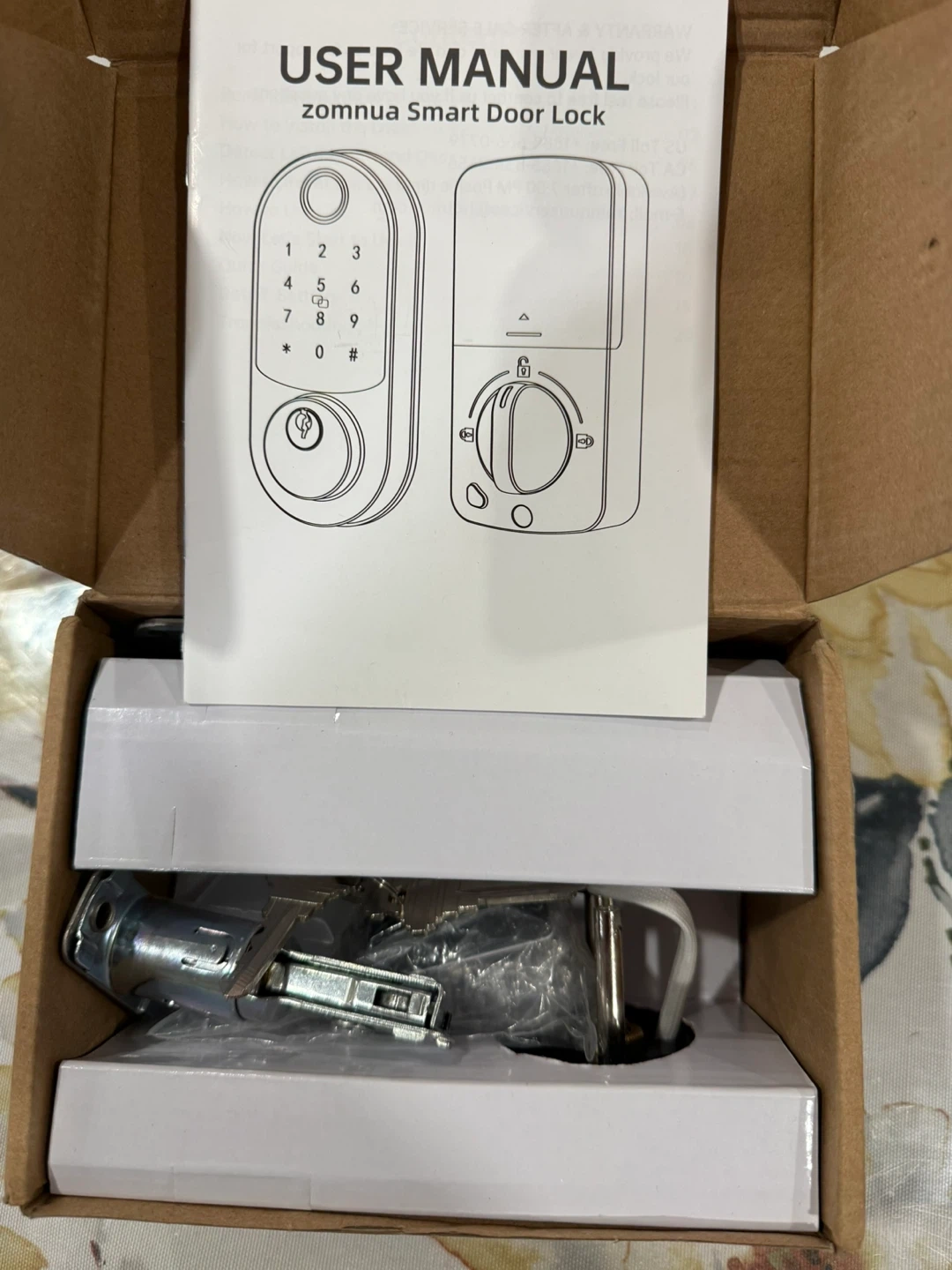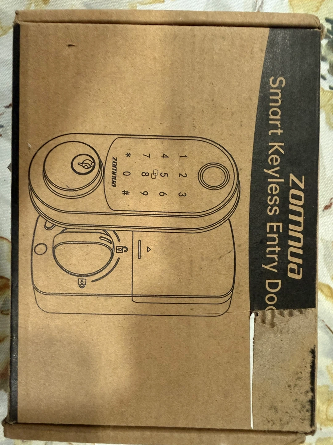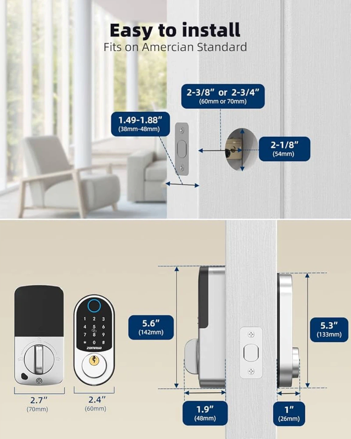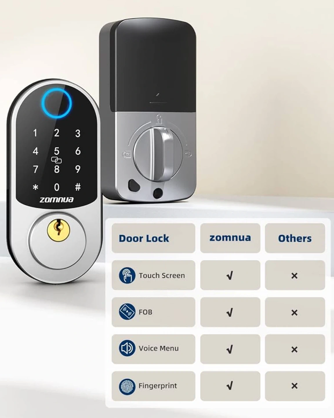 This Zomoua smart door lock features a touchscreen keypad and fingerprint access. It comes with keys and FOBS for alternative entry. It's designed to fit standard American doors and is easy to install.