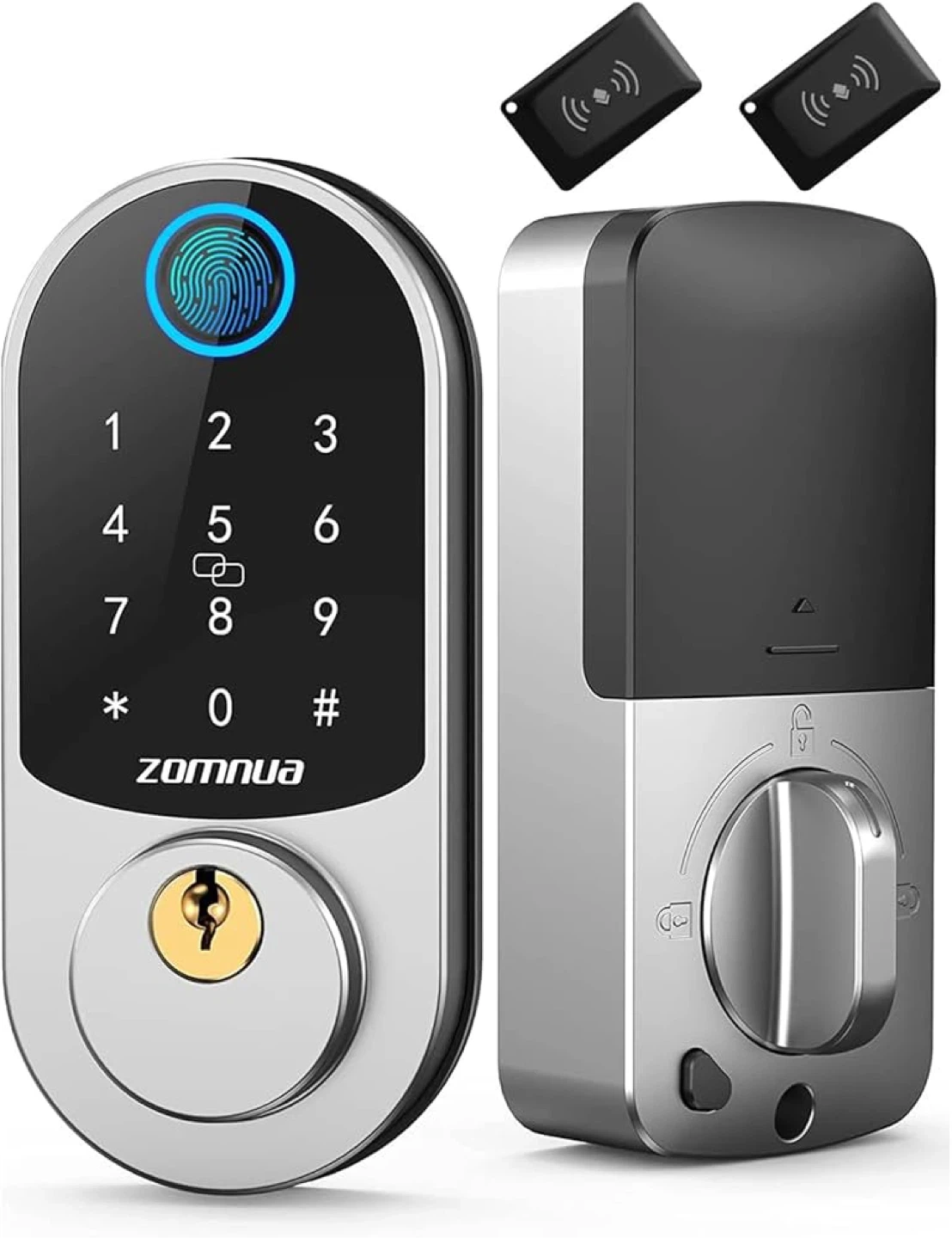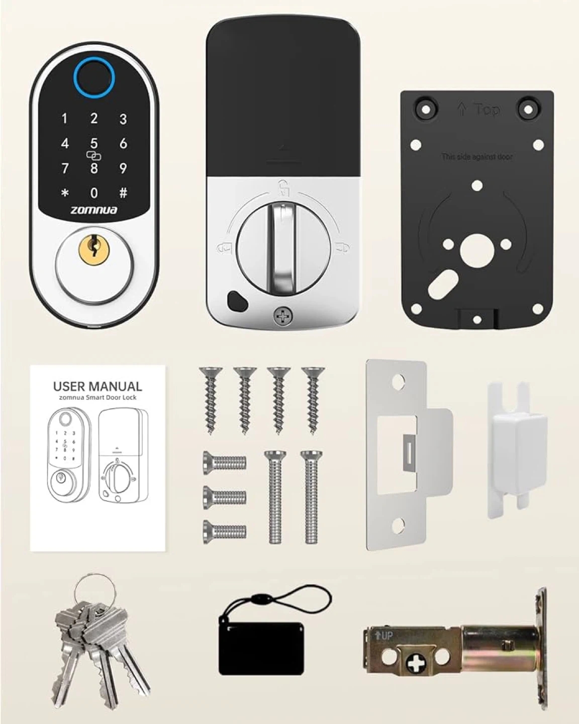 This Zomoua smart door lock features a touchscreen keypad and fingerprint access. It comes with keys and FOBS for alternative entry. It's designed to fit standard American doors and is easy to install.