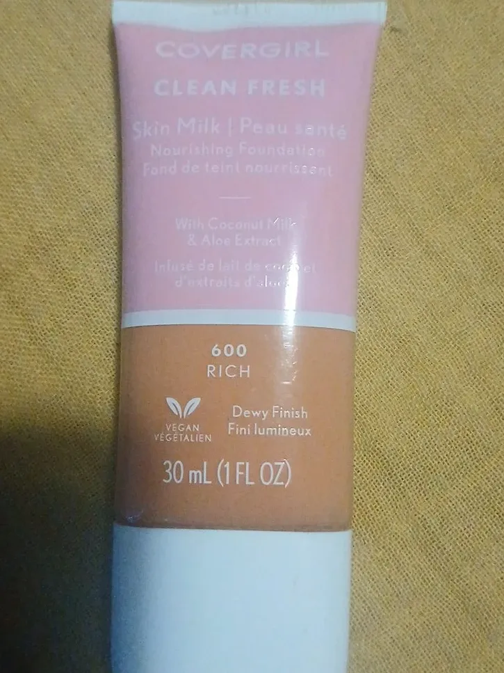 This Covergirl foundation is part of the Clean Fresh line. It's formulated with coconut milk and aloe extract. The shade is 600 Rich and it provides a dewy finish. It's a vegan product, 30 mL (1 fl oz).