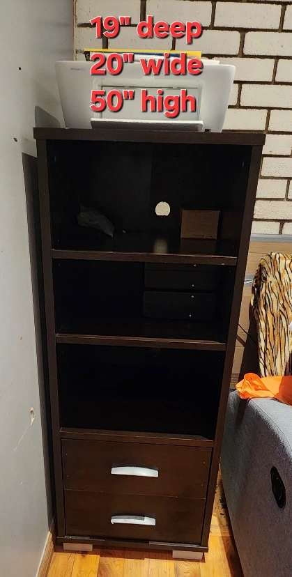Selling a dark brown wooden shelf. It features open shelving and drawers at the bottom.