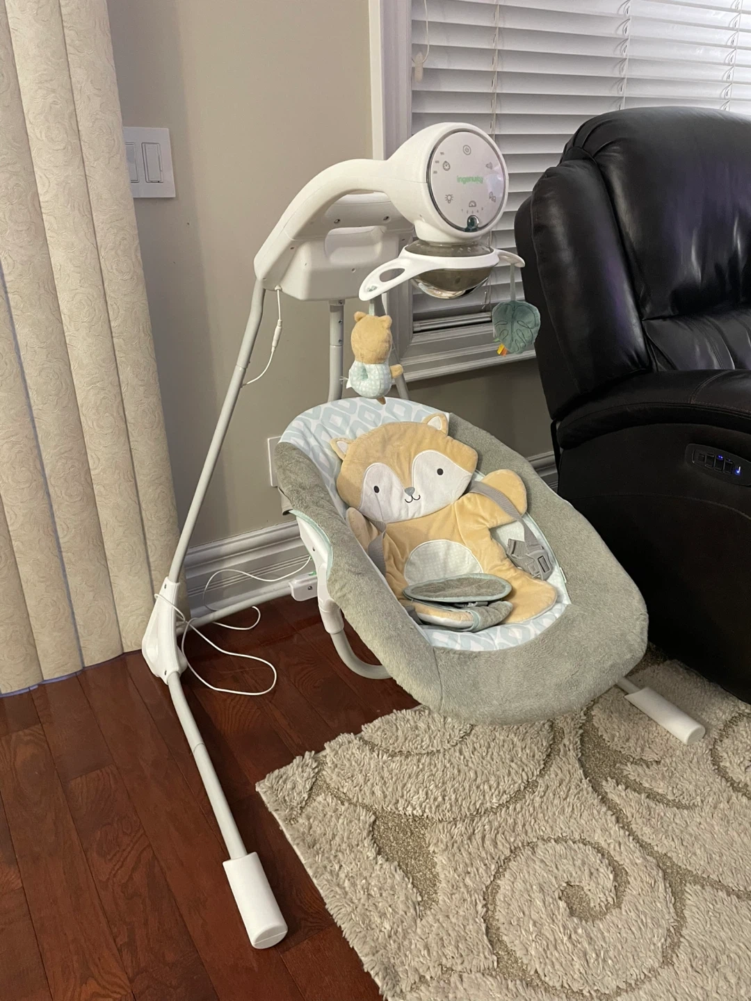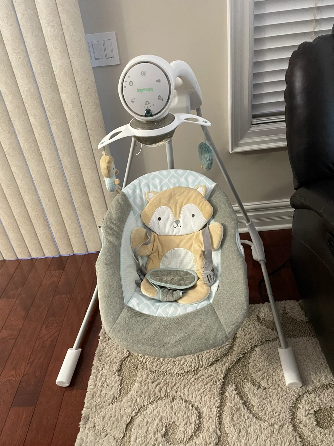 Selling an Ingenuity InLighten 5-Speed Baby Swing. It features a swivel infant seat, a 5-point safety harness, nature sounds, and lights. The design is the adorable Kitt Fox!