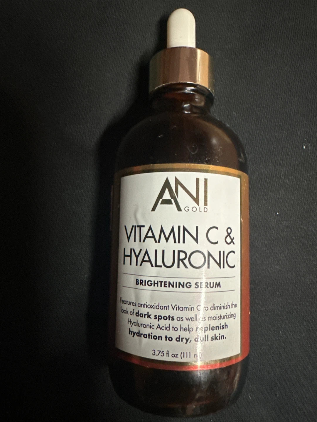 ANI GOLD Vitamin C & Hyaluronic Brightening Serum. Features antioxidant Vitamin C to diminish the look of dark spots. Hyaluronic Acid moisturizes to replenish hydration. 3.75 fl oz (111 ml). This serum helps to hydrate dry, dull skin.