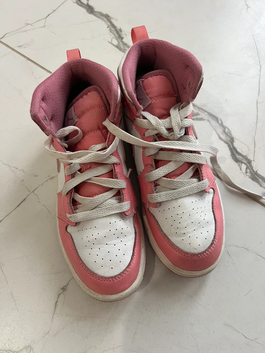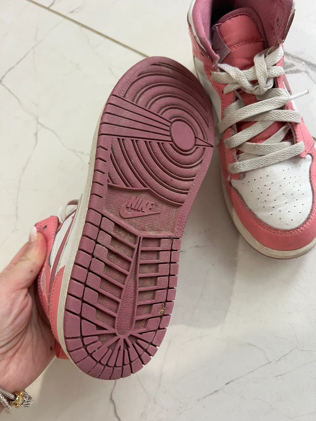 Selling a pair of Nike Air Jordan 1 High toddler shoes in size 2Y. They're in good condition and ready for a new little one to enjoy! The shoes feature a stylish pink and white colourway.