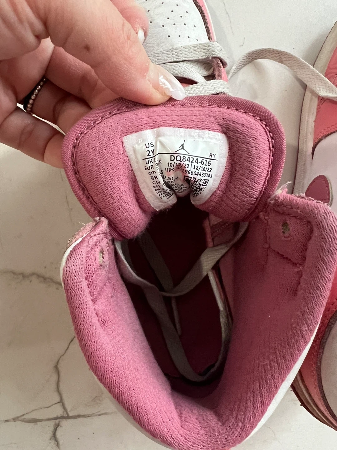 Selling a pair of Nike Air Jordan 1 High toddler shoes in size 2Y. They're in good condition and ready for a new little one to enjoy! The shoes feature a stylish pink and white colourway.