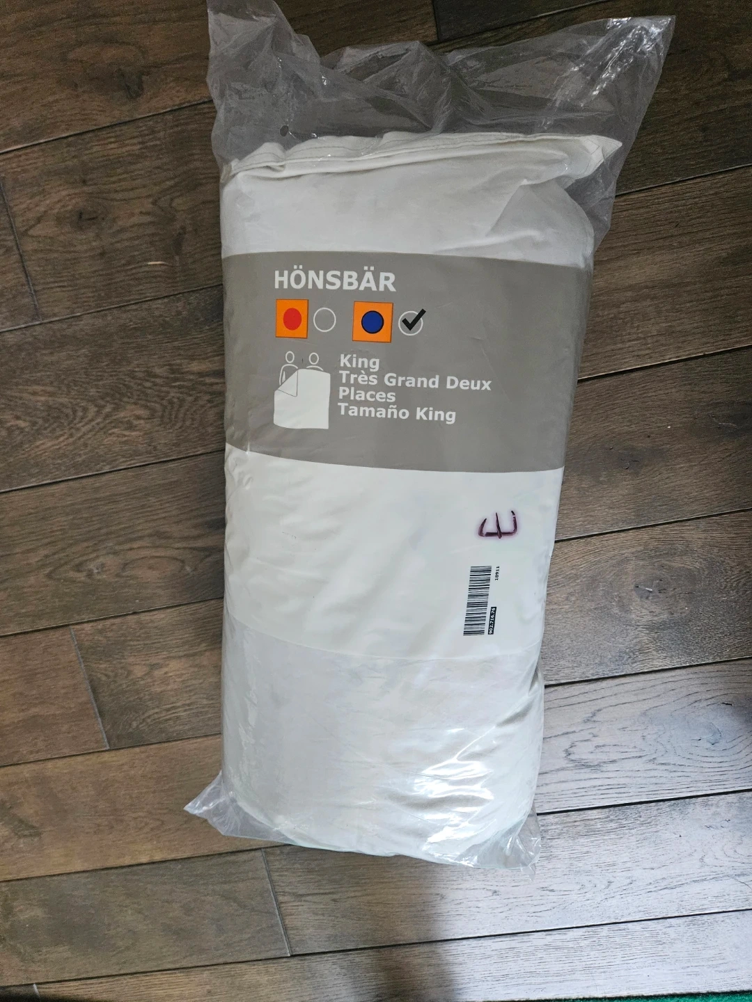 This is a brand new, white, king-sized duvet from IKEA's HÖNSBÄR collection. It's made of a soft material perfect for a comfortable sleep. The duvet is still in its original packaging.