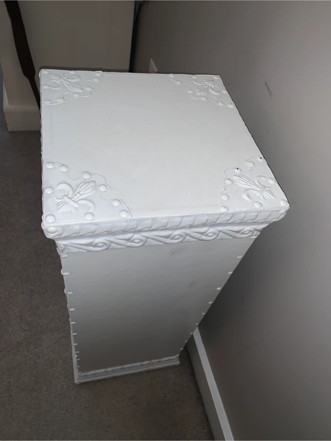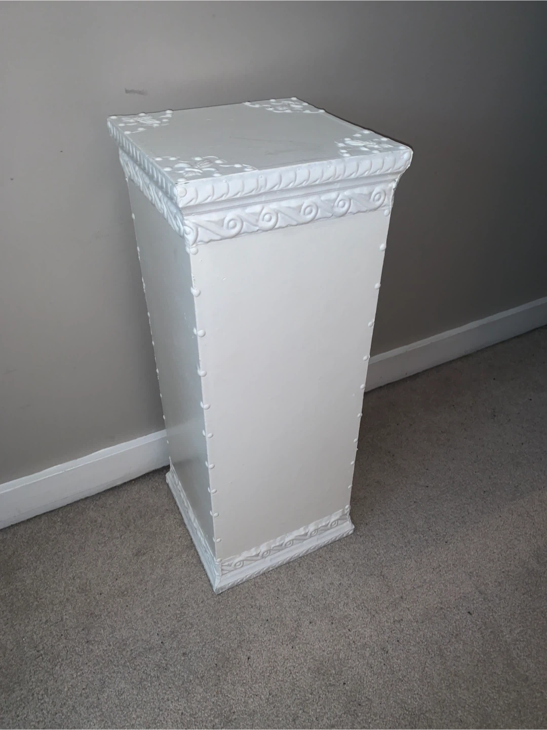 This decorative pedestal stand is painted white with ornate detailing. It's a lovely piece for displaying plants or decor. Could be used indoors or outdoors.