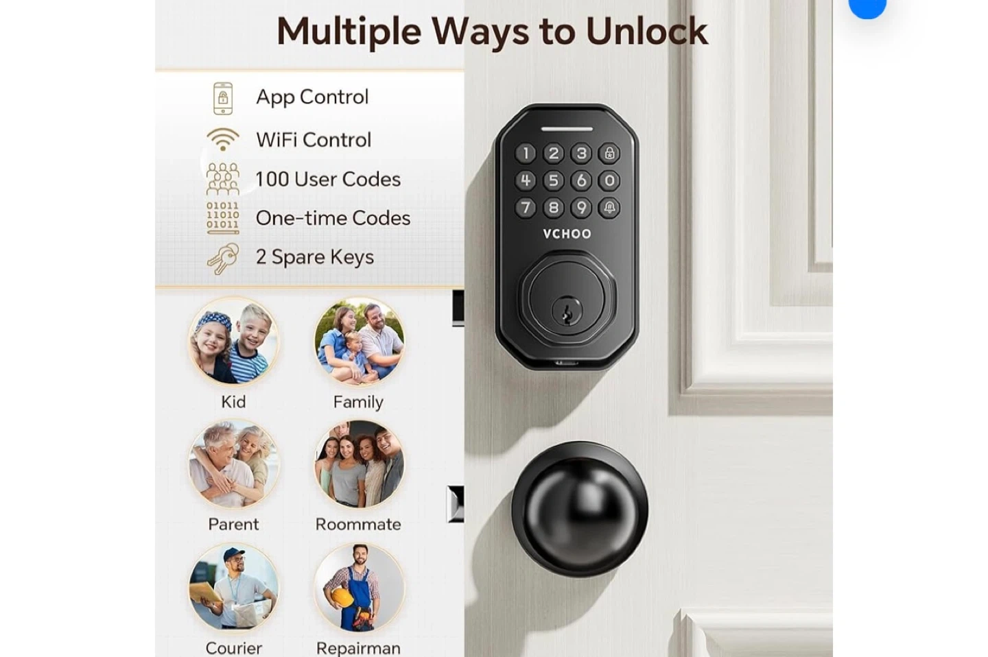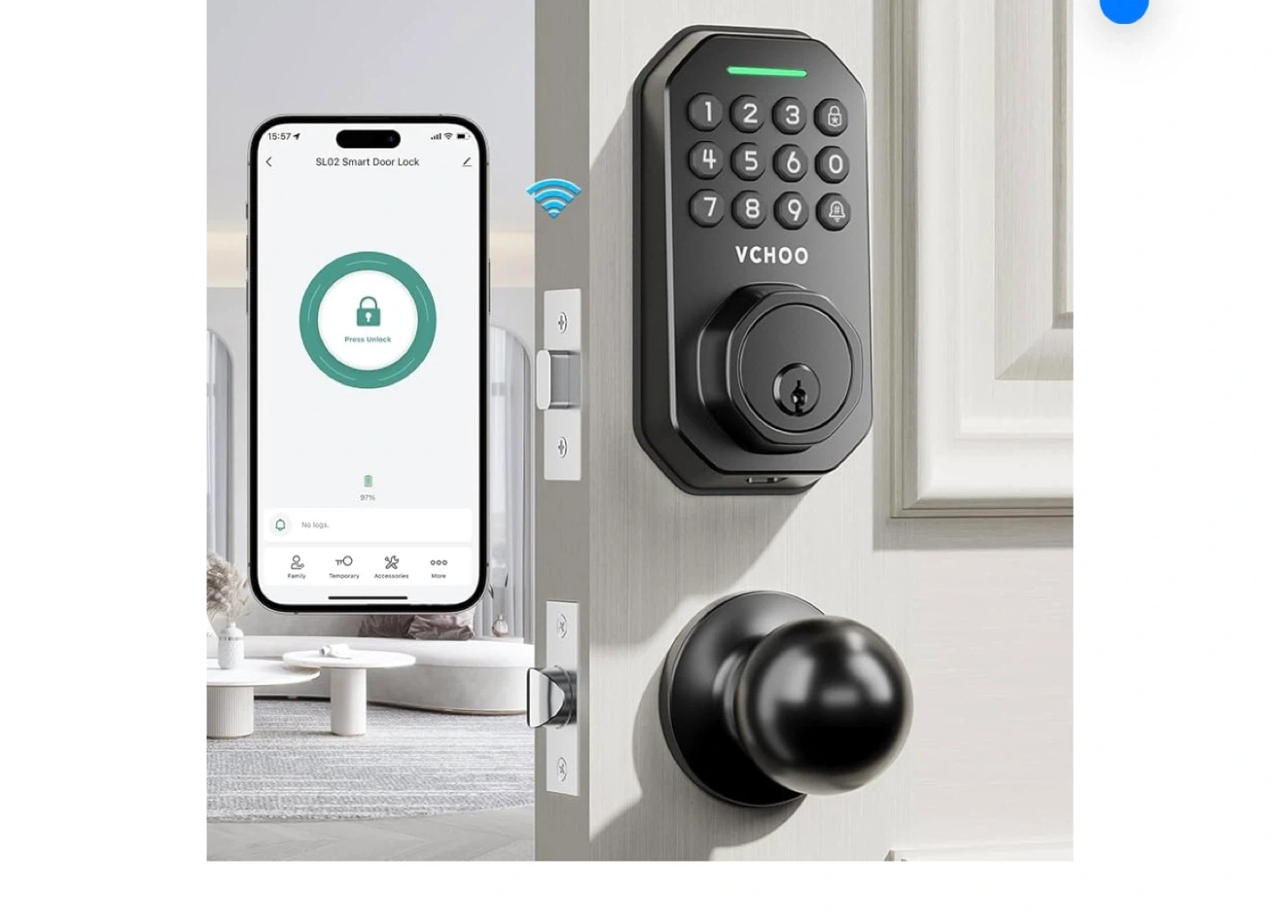 Selling a Vchoo Smart Door Lock. It features WiFi control, app unlock, and supports 100 user codes. It also has a low battery alert, anti-peep keypad, and one-touch lock. It's IP54 waterproof and charges with a Type-C cable