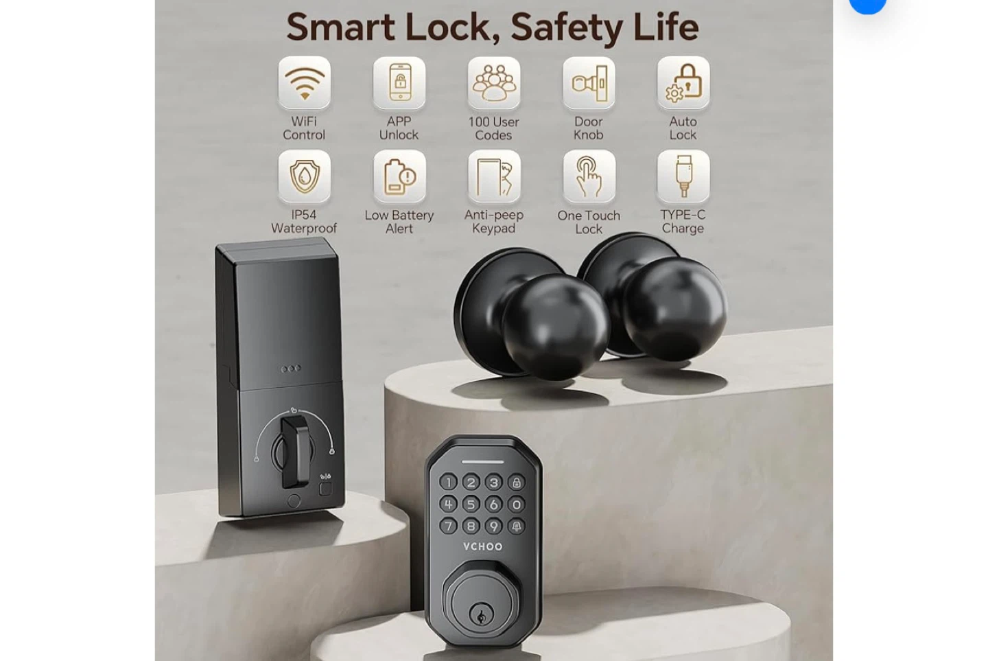 Selling a Vchoo Smart Door Lock. It features WiFi control, app unlock, and supports 100 user codes. It also has a low battery alert, anti-peep keypad, and one-touch lock. It's IP54 waterproof and charges with a Type-C cable