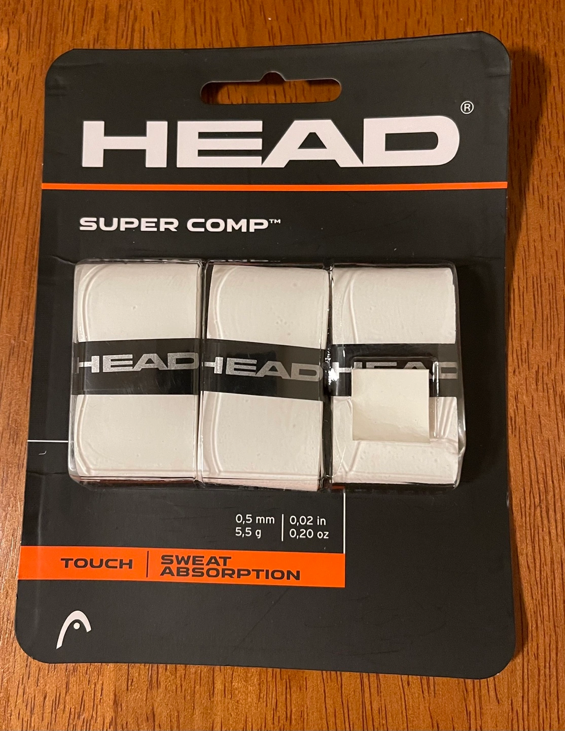Three white HEAD Super Comp overgrips. Sweat absorption. 0.5 mm thick. Unopened. Packaging is a little messed up though.