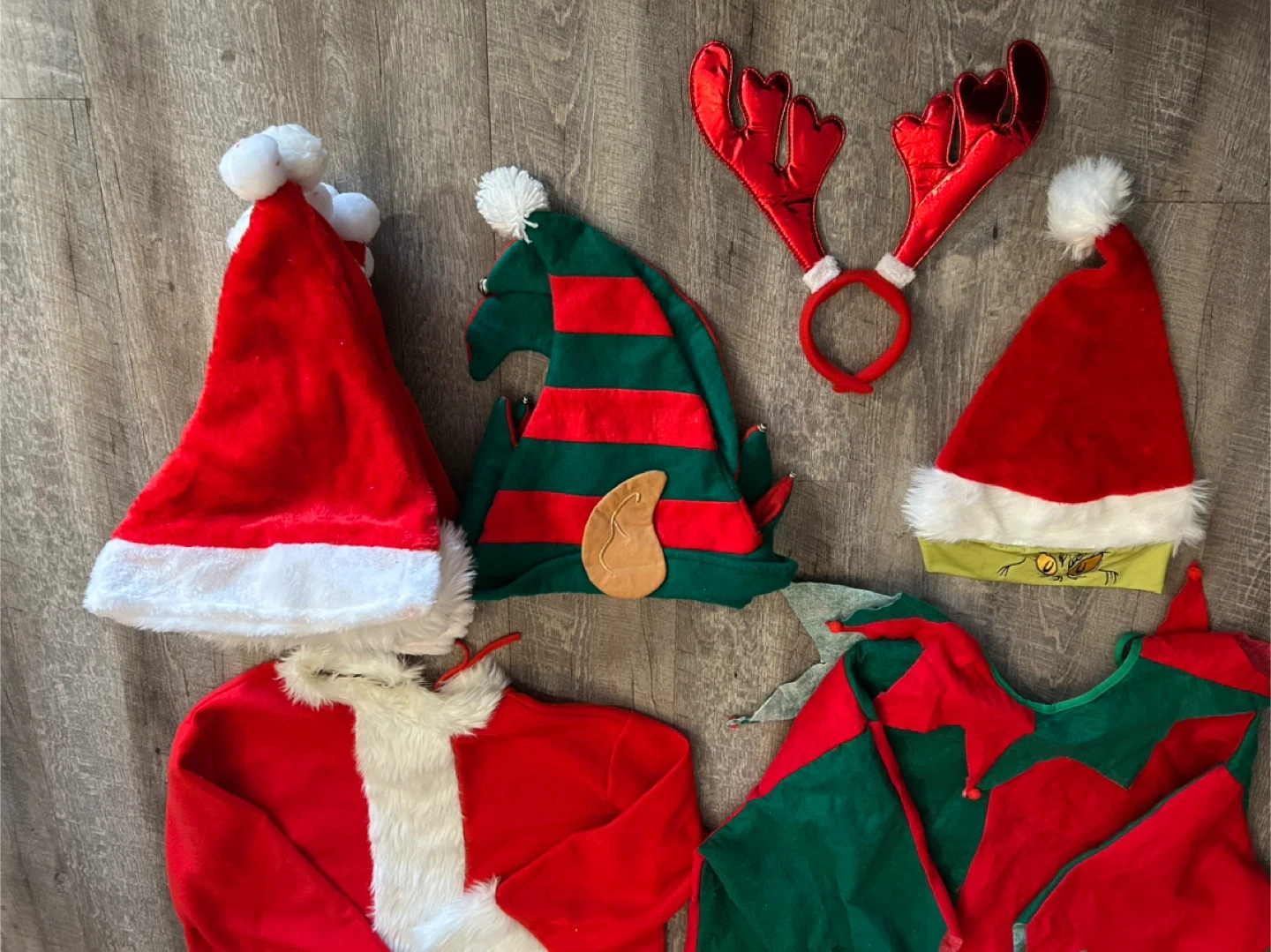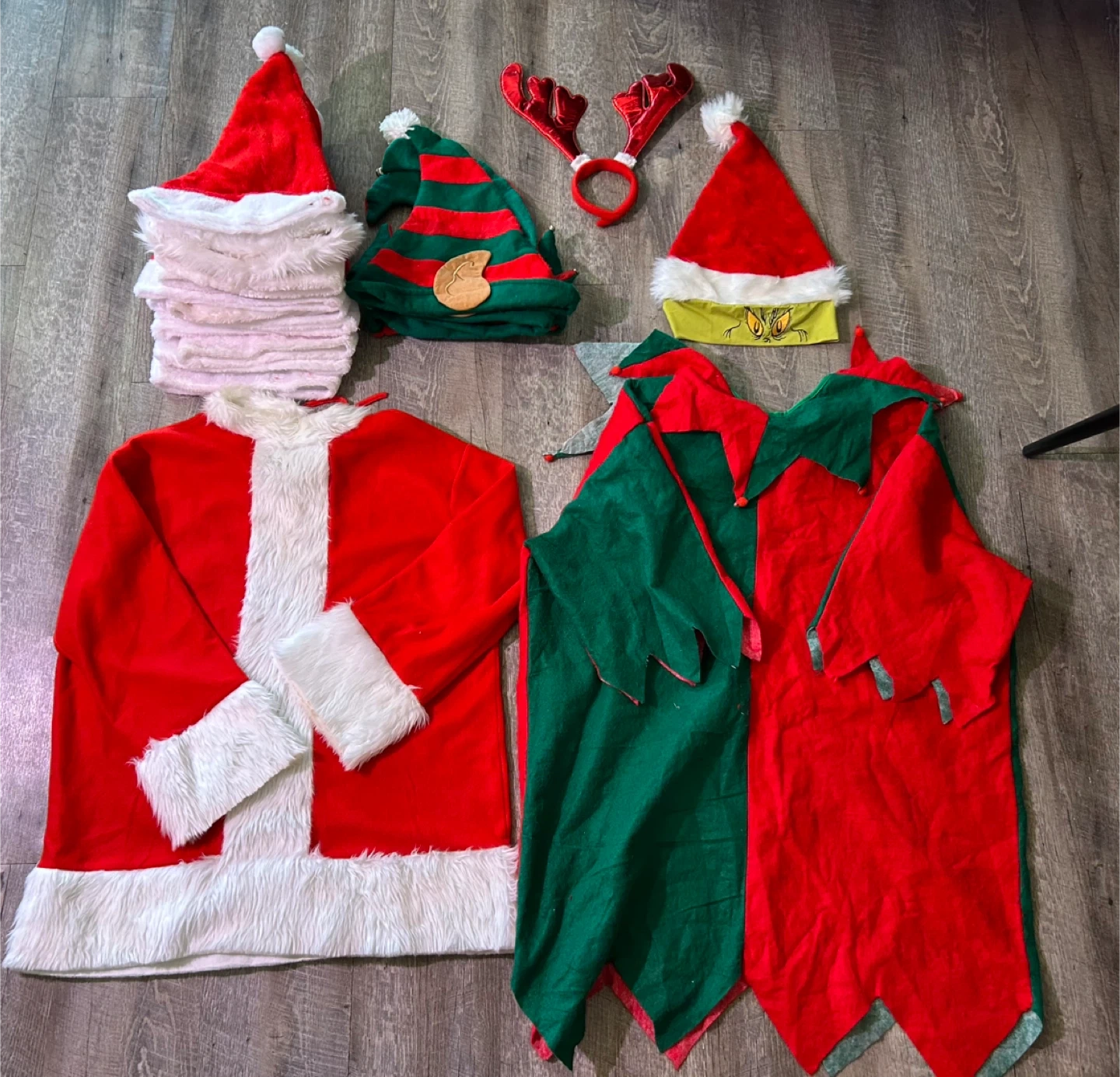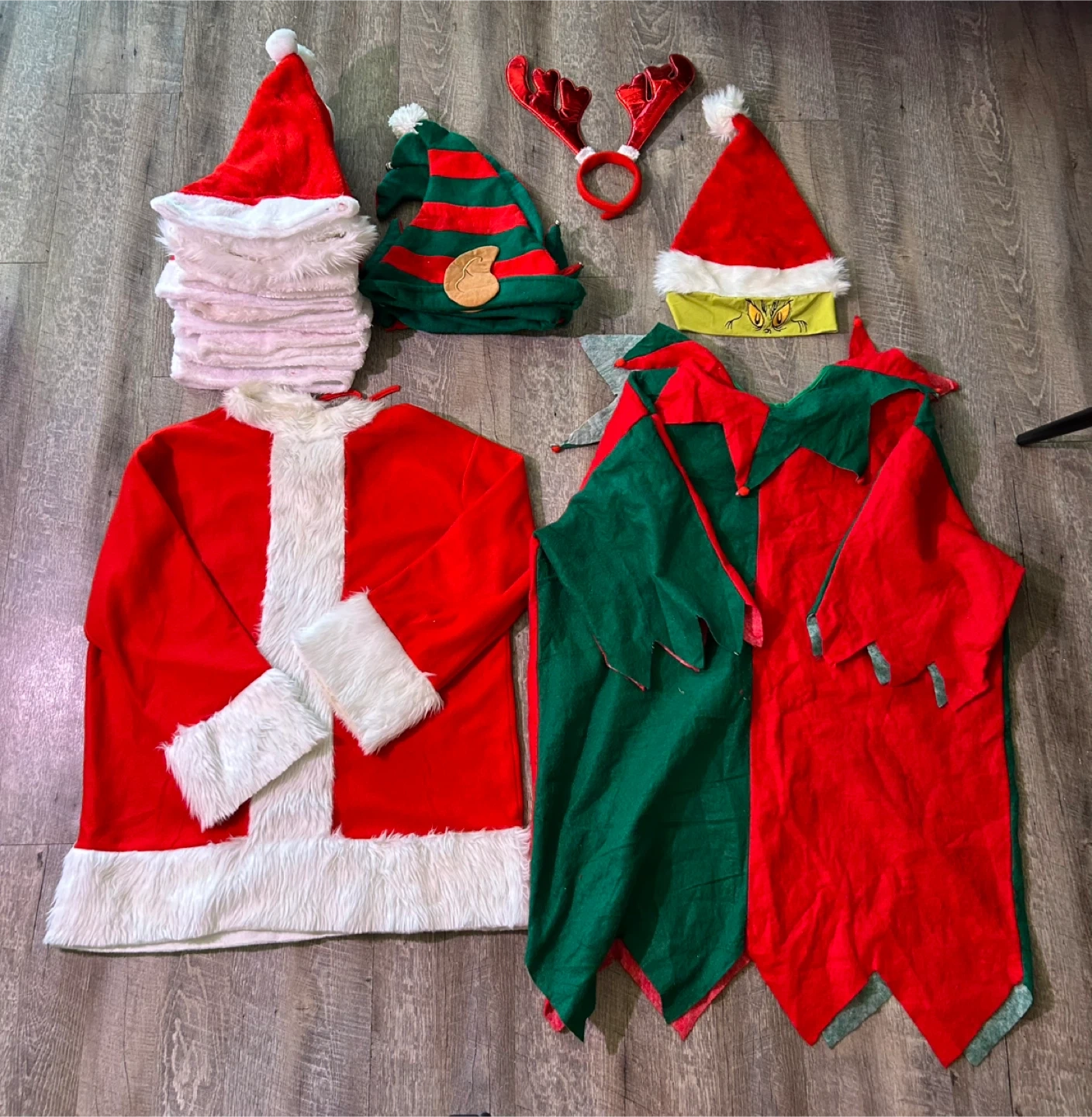 This lot includes several Christmas-themed costume pieces. You'll find a Santa suit jacket with trim (one size fits all up to 2X), a green and red elf suit (one size fits all up to 3X), 12 Santa hats, 3 elf hats, one Grinch Santa hat, and a pair of reindeer antlers. Perfect for holiday parties or festive events!
