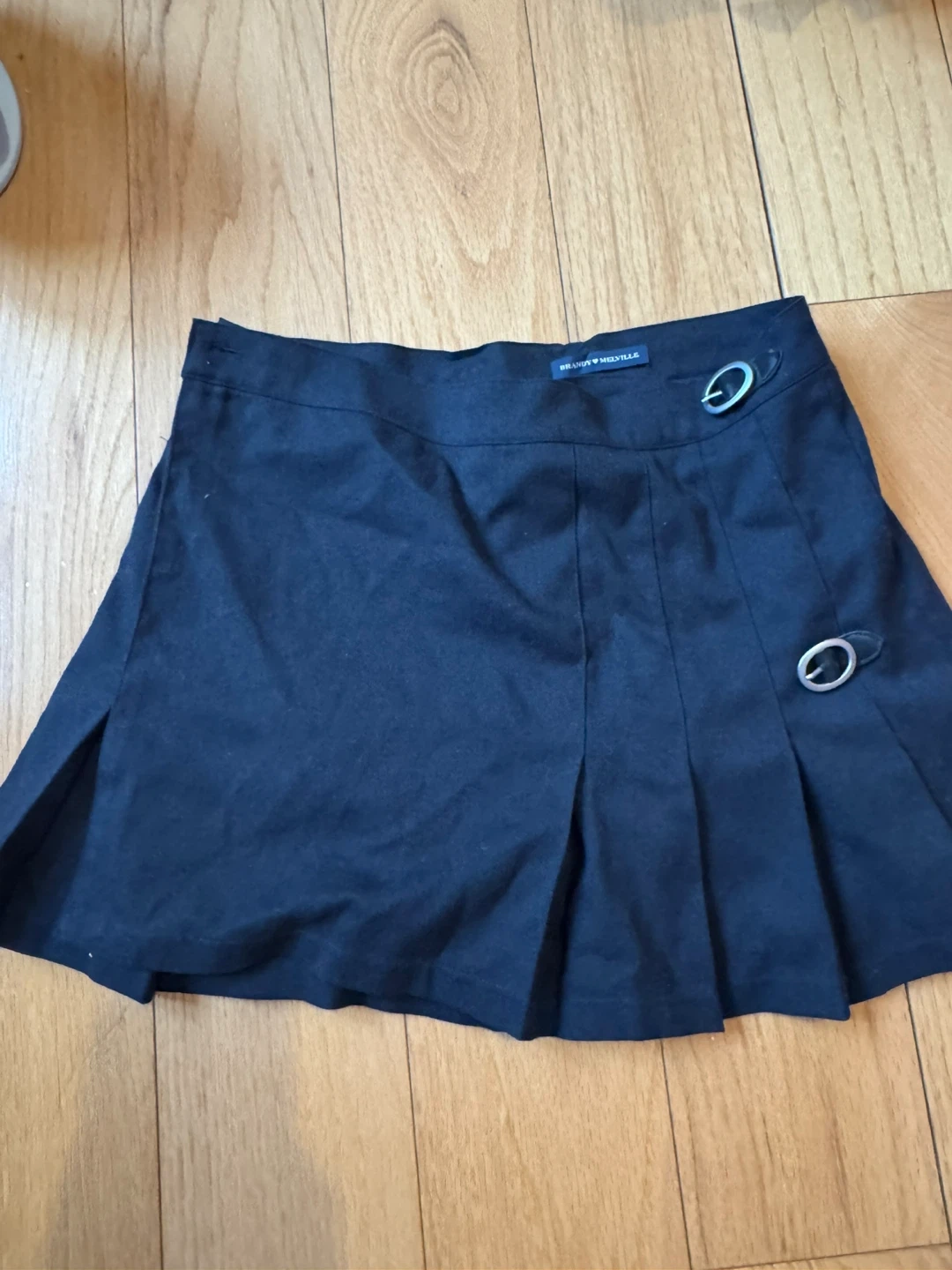 A black Brandy Melville mini skirt. It has a pleated design with silver buckle accents. This skirt is great for a casual or dressed-up look!