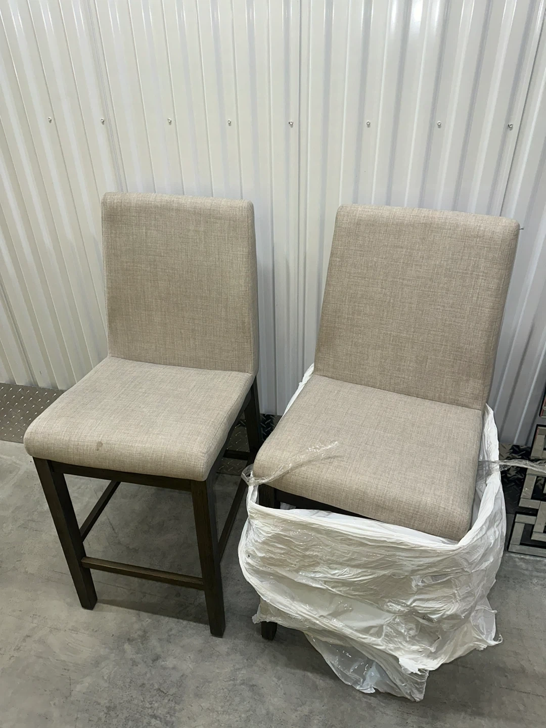 Selling a set of 4 counter height stools. They feature a neutral fabric upholstery and dark wood legs. Great for a kitchen island or bar area!