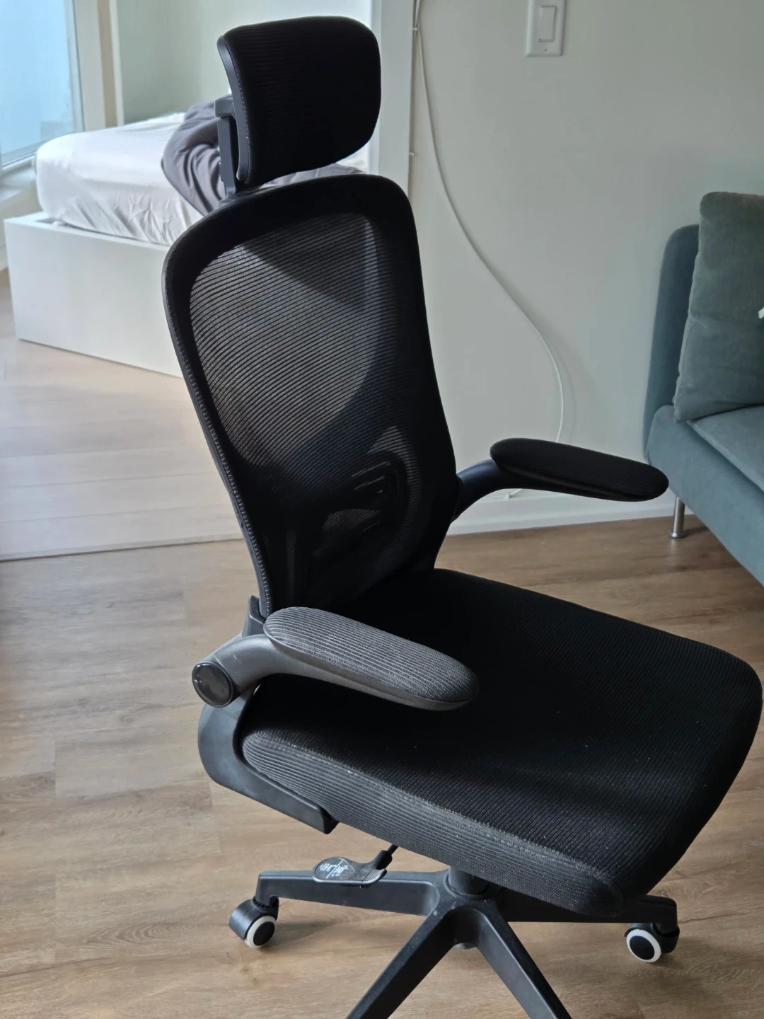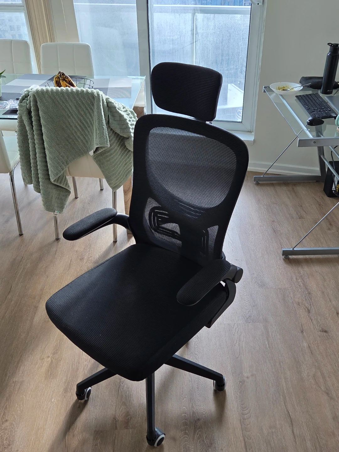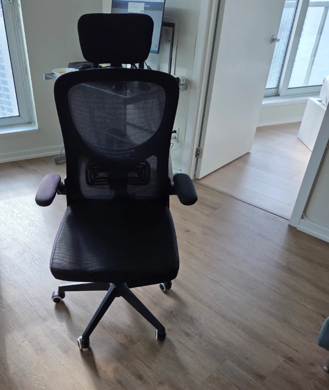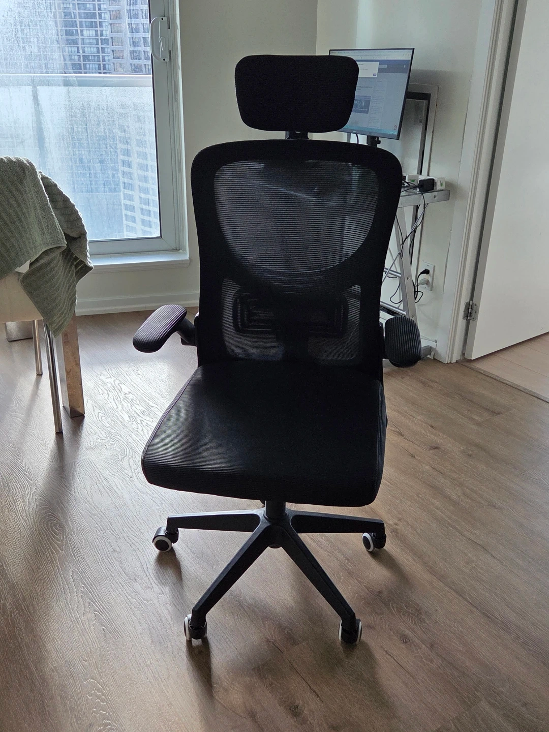 Comfortable black mesh office chair with adjustable headrest and armrests. It has a sturdy base with wheels for easy mobility. Mesh back provides good ventilation.
