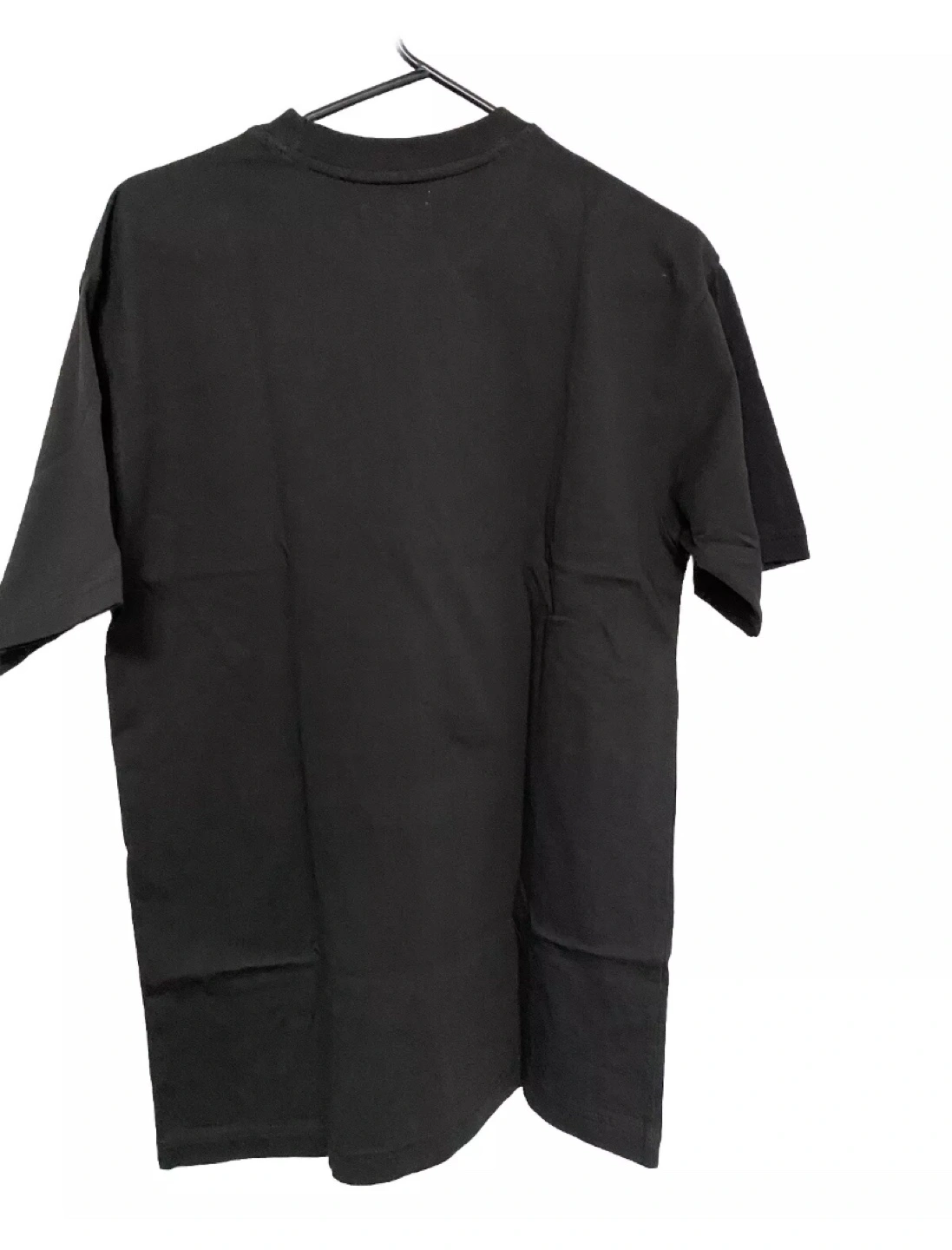 Black short-sleeved T-shirt with white graphic print. Size M.