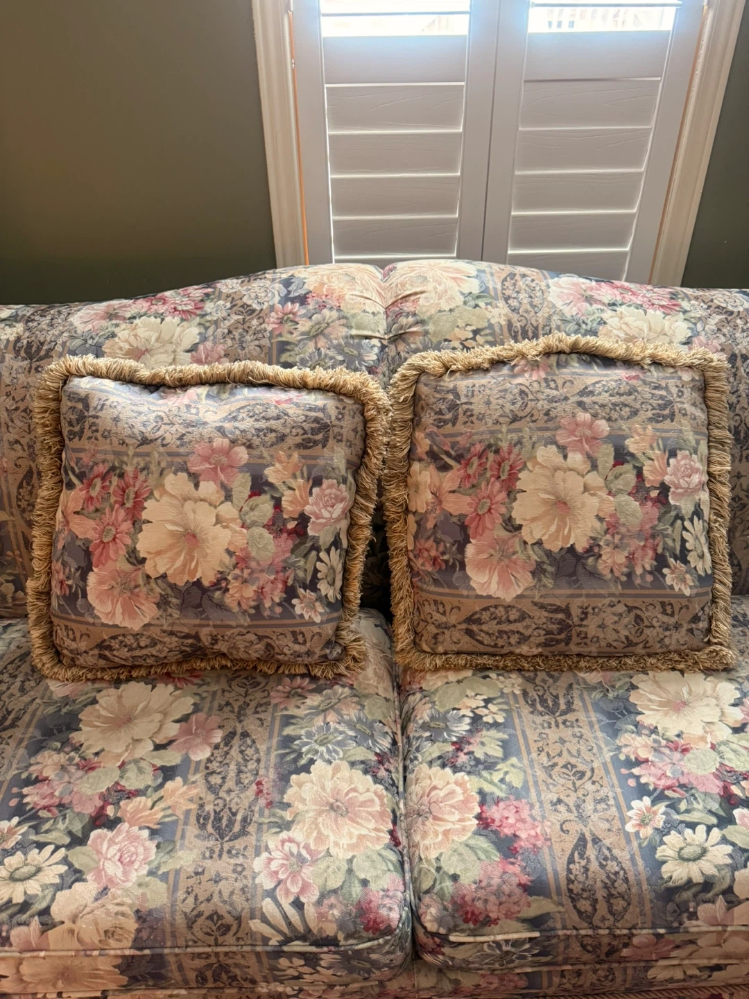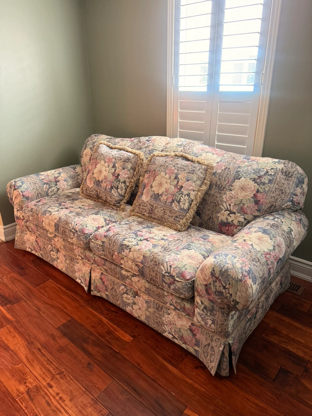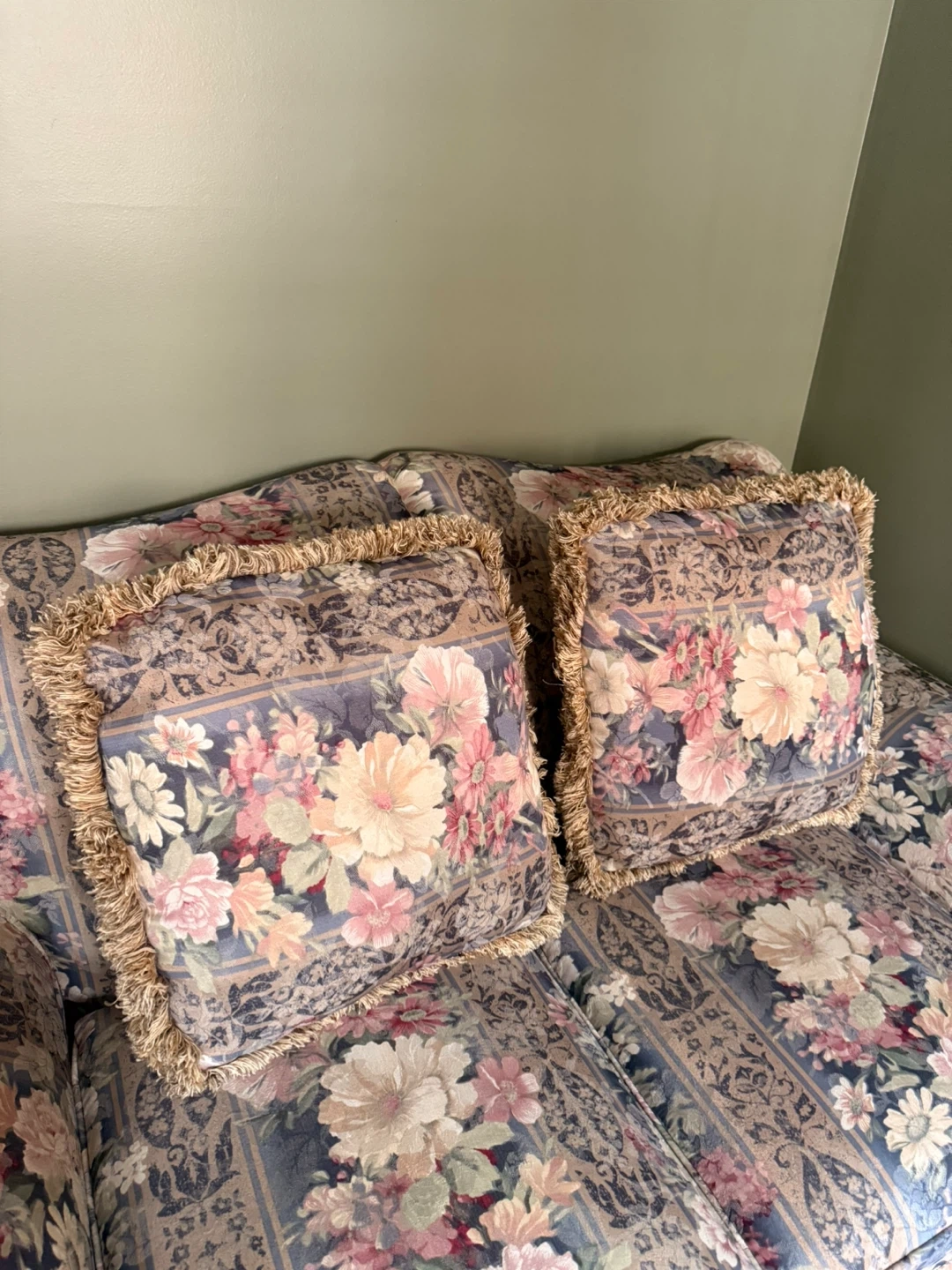 These couches feature a vintage floral upholstery with coordinating toss pillows. It has a skirted base and plush cushioning. The patterned fabric includes shades of pink, blue, and cream. Used. Still in great condition. Asking $300 OBO!