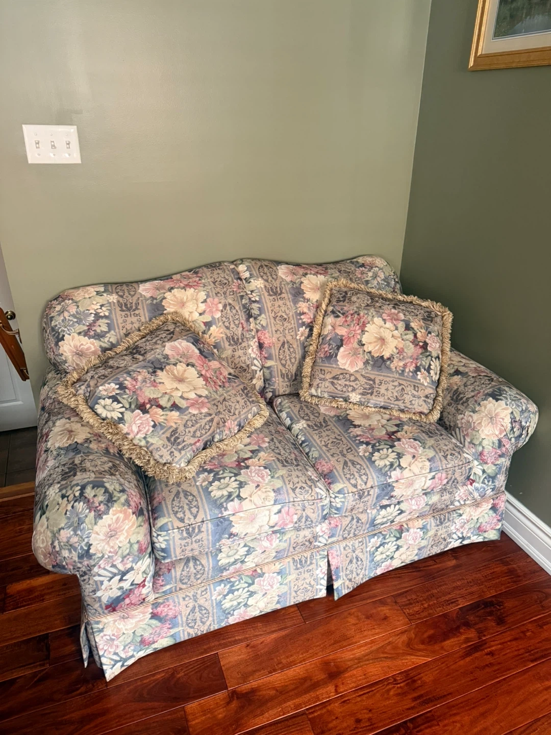 These couches feature a vintage floral upholstery with coordinating toss pillows. It has a skirted base and plush cushioning. The patterned fabric includes shades of pink, blue, and cream. Used. Still in great condition. Asking $300 OBO!