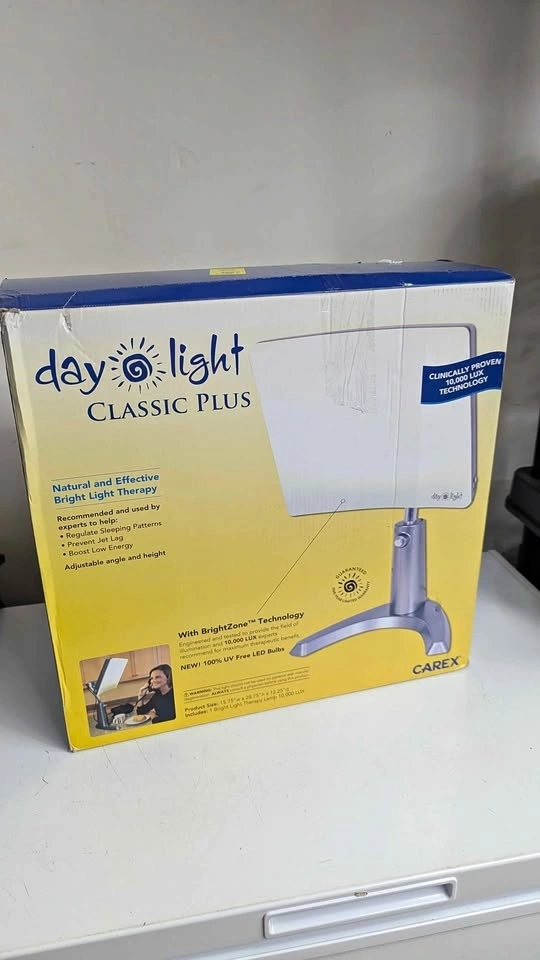 New in box, never unpacked. Guaranteed working. This CAREX daylight CLASSIC PLUS lamp is great for natural bright light therapy. It helps regulate sleep patterns, prevent jet lag, and boost low energy. Has adjustable angle and height, BrightZone Technology, and clinically proven 10,000 LUX tech with 100% UV-free LED bulbs. Product size is 15.75"w x 28.75"h x 12.25"d.