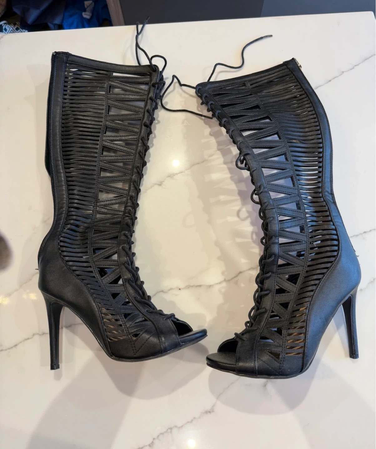 Stylish black heeled boots with an open toe and intricate lace-up detail. These boots reach to the knee and feature a cut-out design throughout. Back zipper closure for easy wear. Perfect for adding a bold statement to any outfit!