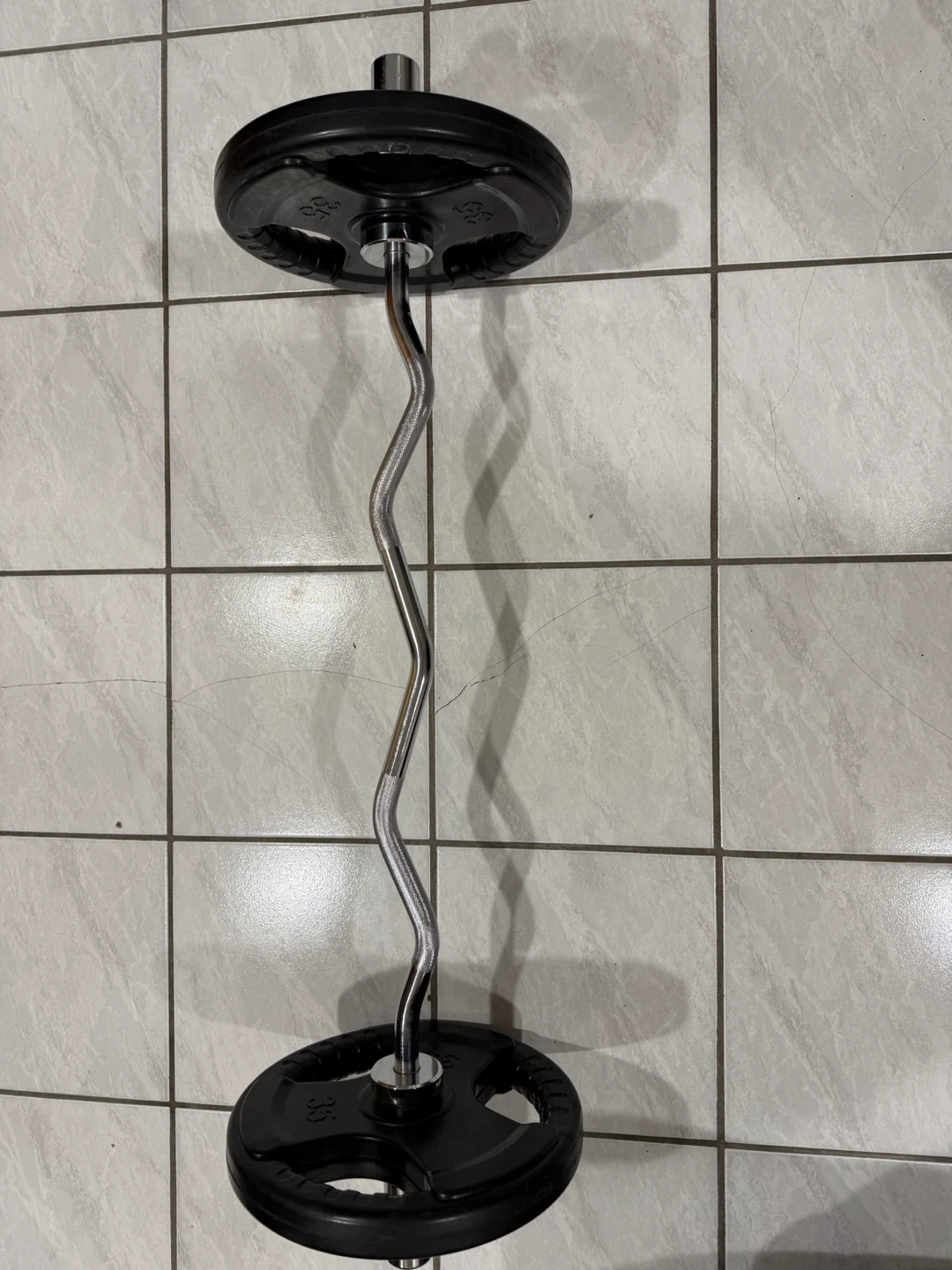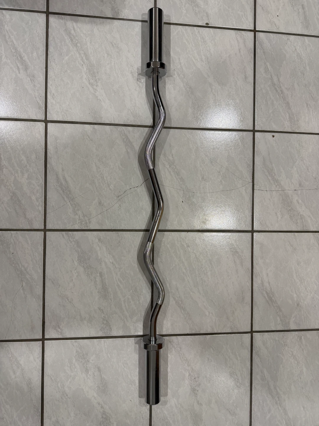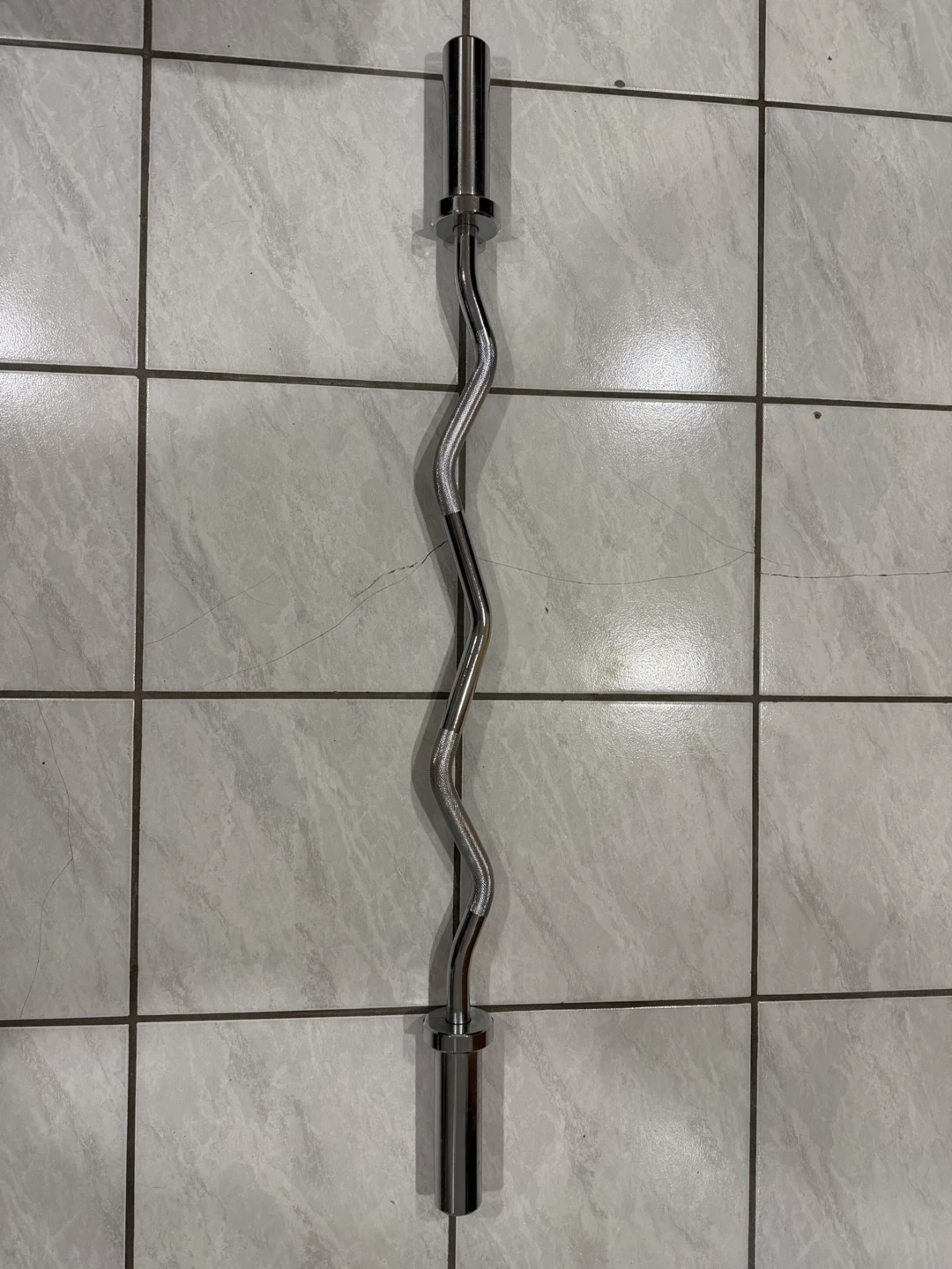Chrome curl barbell for bicep and tricep workouts. It's made of durable chrome-plated steel. The contoured grip helps reduce strain on your wrists.