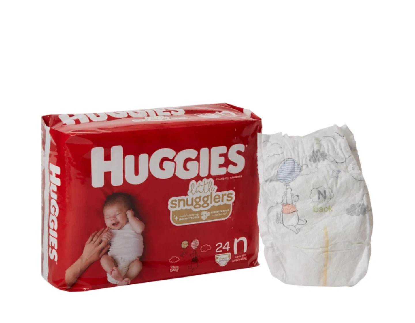 Huggies Little Snugglers diapers in size N. Package contains 24 diapers. Up to 10 lbs. Designed for gentle skin protection.
