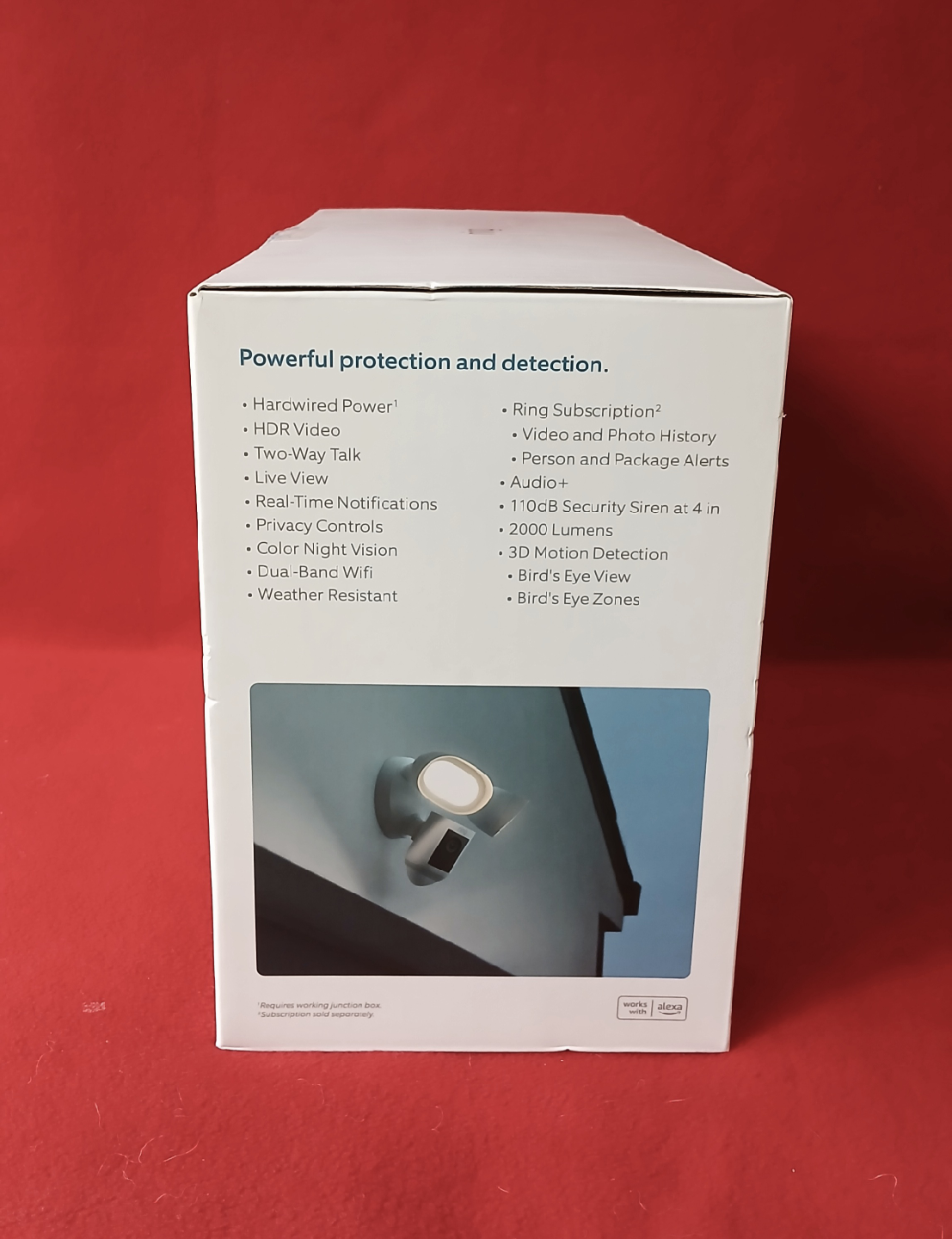 It offers powerful protection and detection with features like a hardwired power source, ring subscription, video and photo history, person and package alerts, a 110dB security siren, 2000 lumens, and bird's eye view and zones.