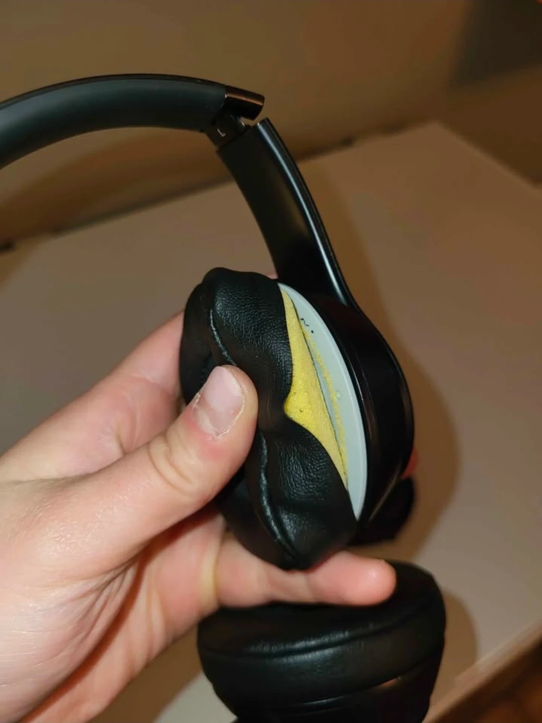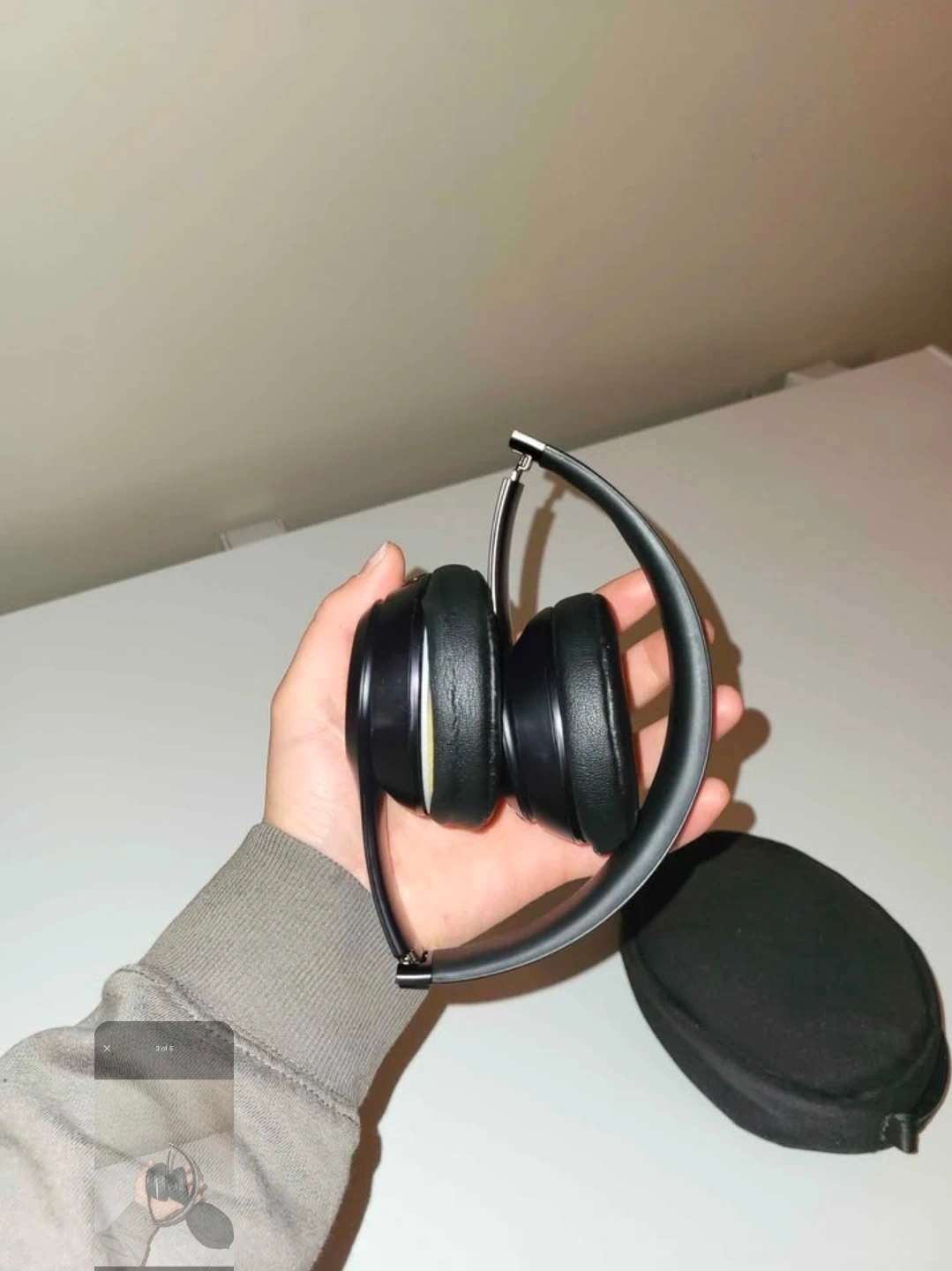 Black Beats Solo3 wireless on-ear headphones. Includes original carrying case. Ear pad foam is exposed on one side.