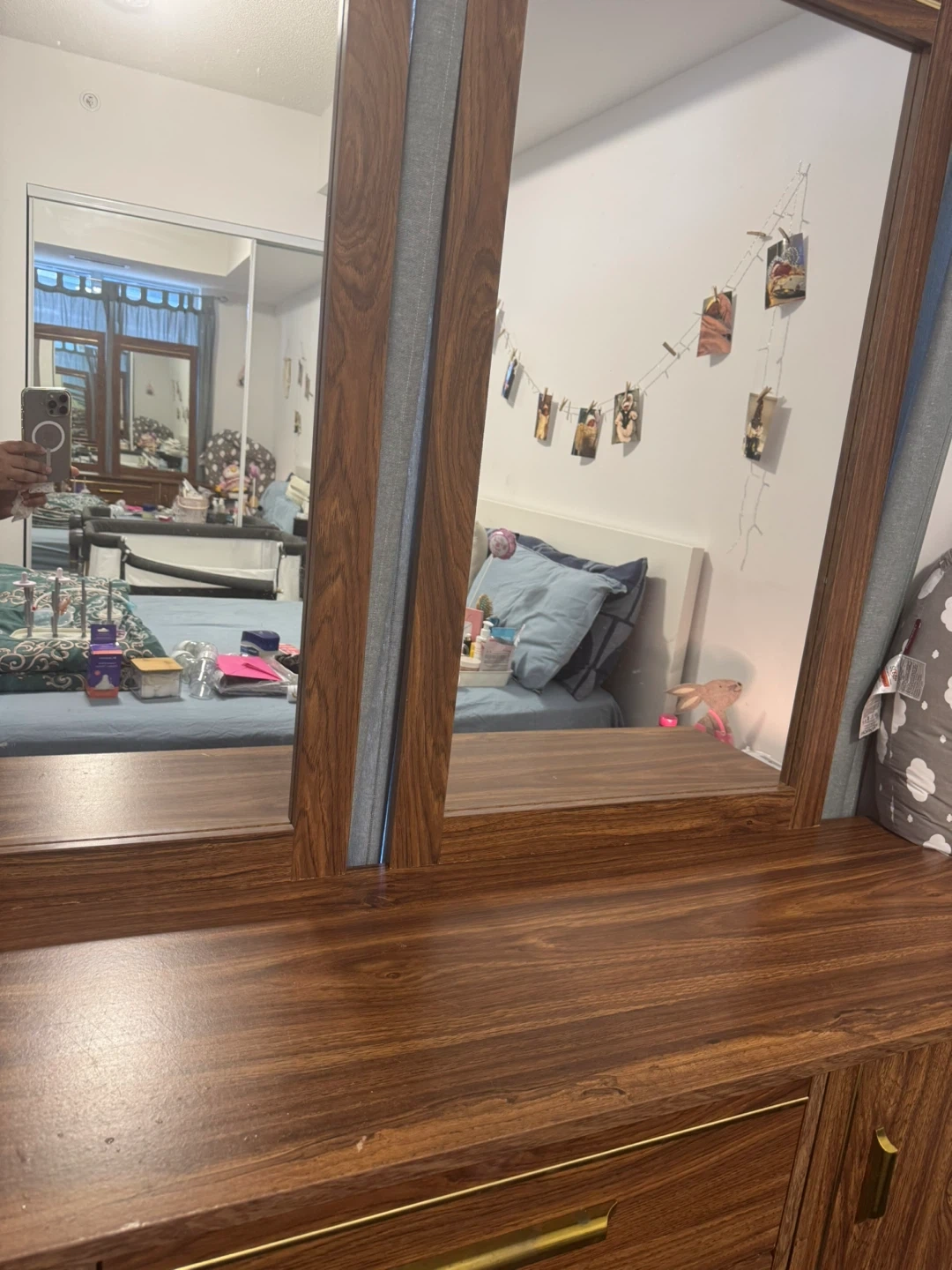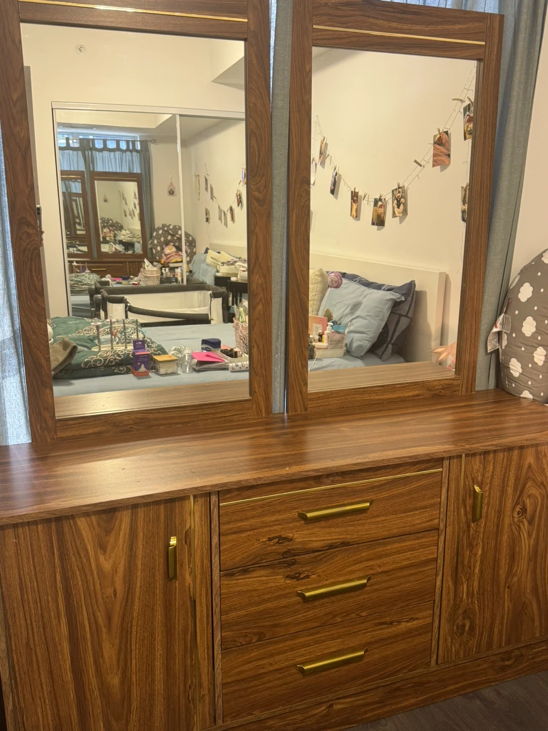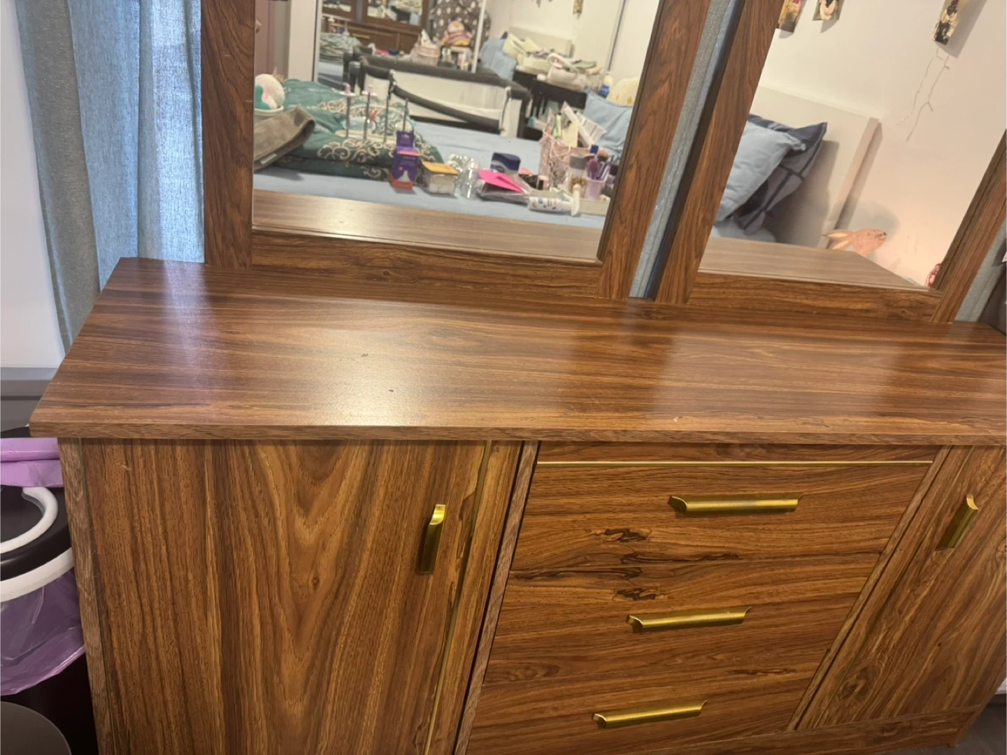 Elegant solid wood dresser with a large mirror, perfect for a bedroom or dressing area. The rich wood grain and modern gold handles give it a stylish, high-end look.