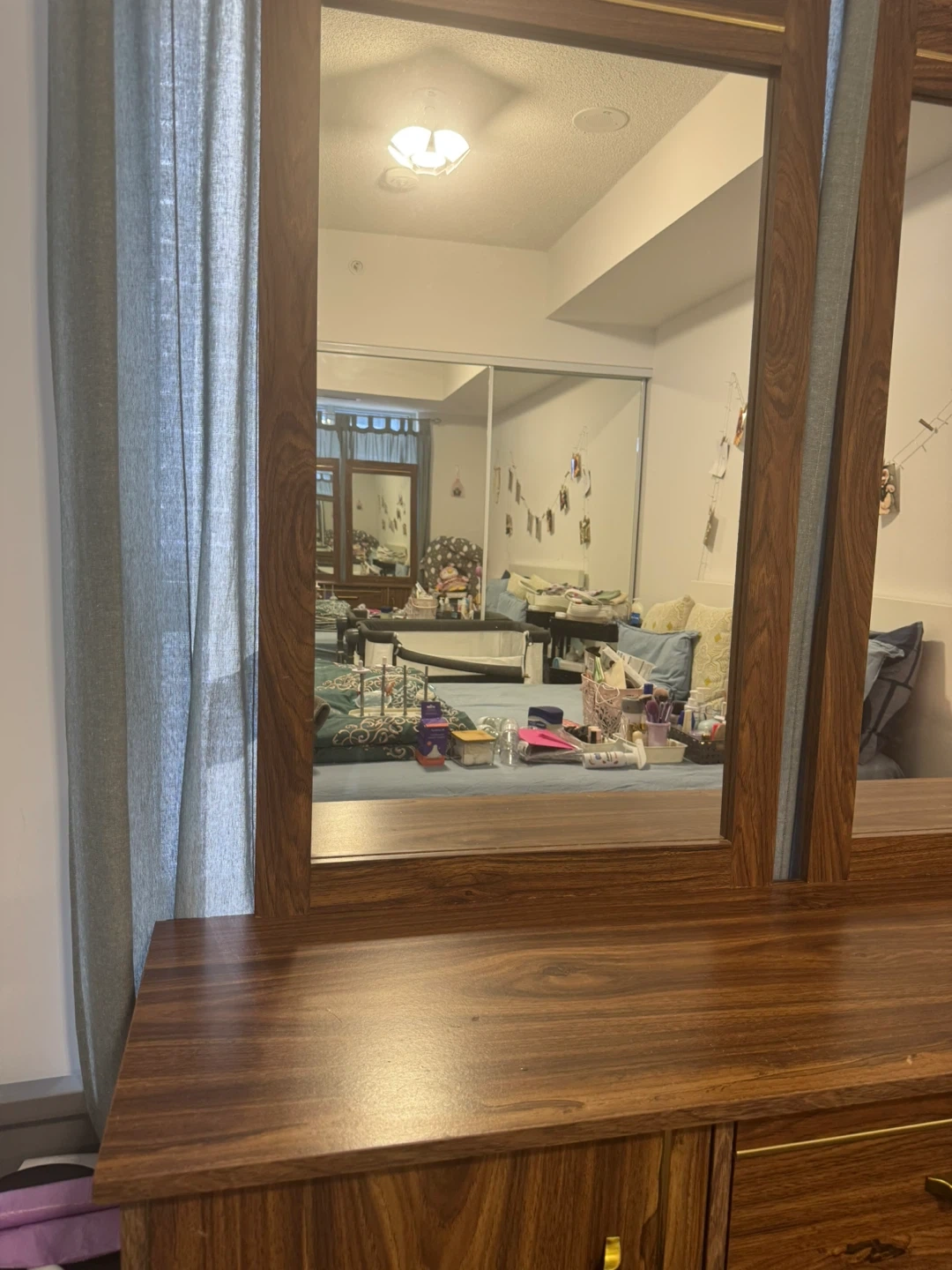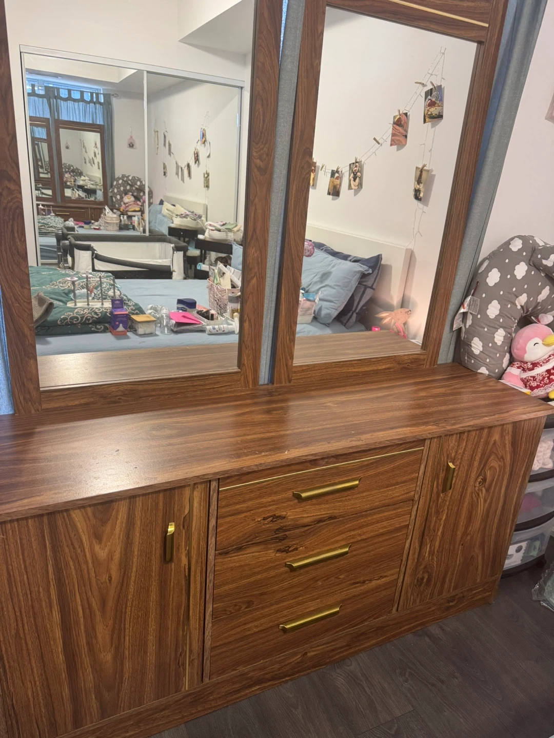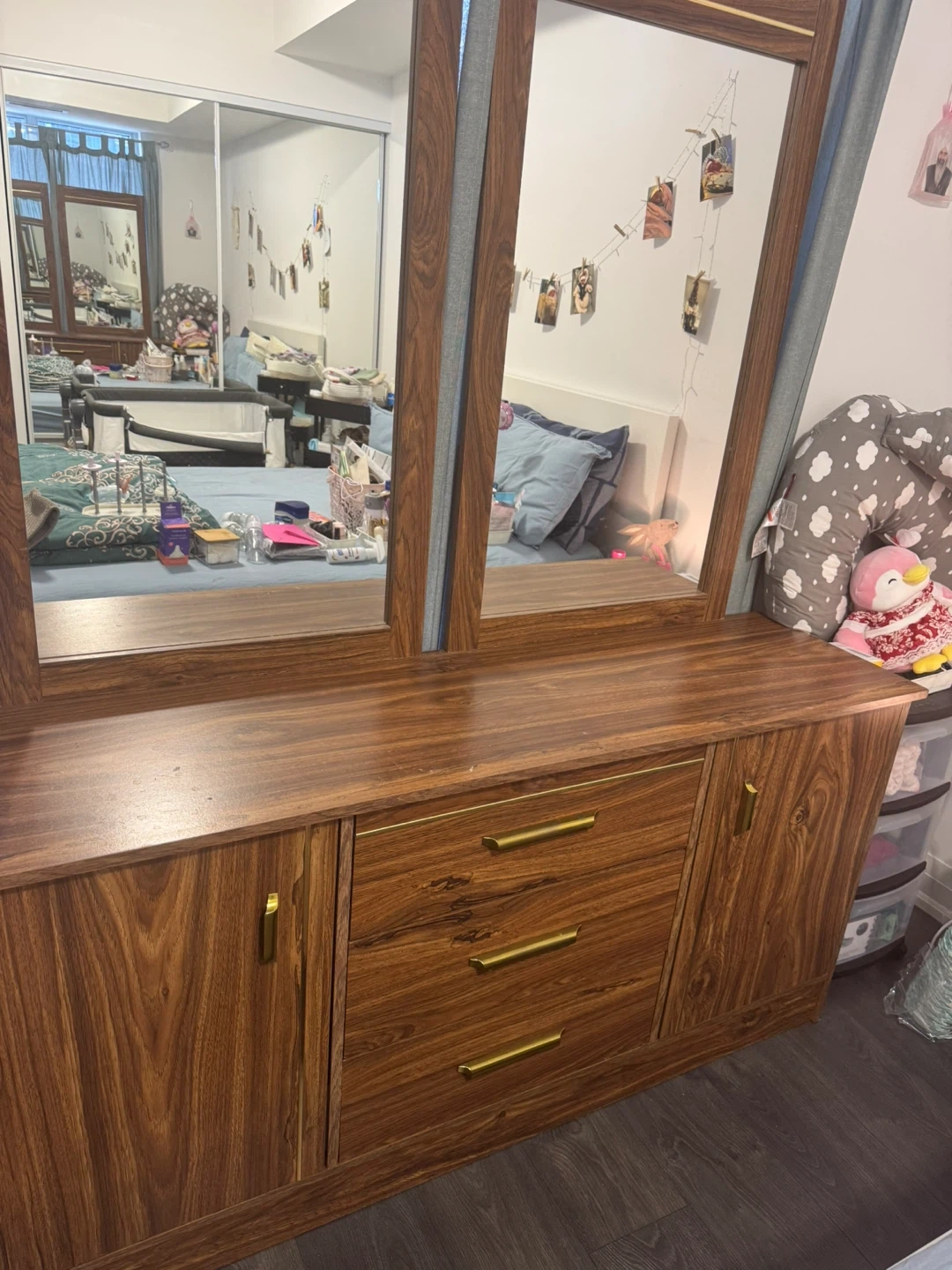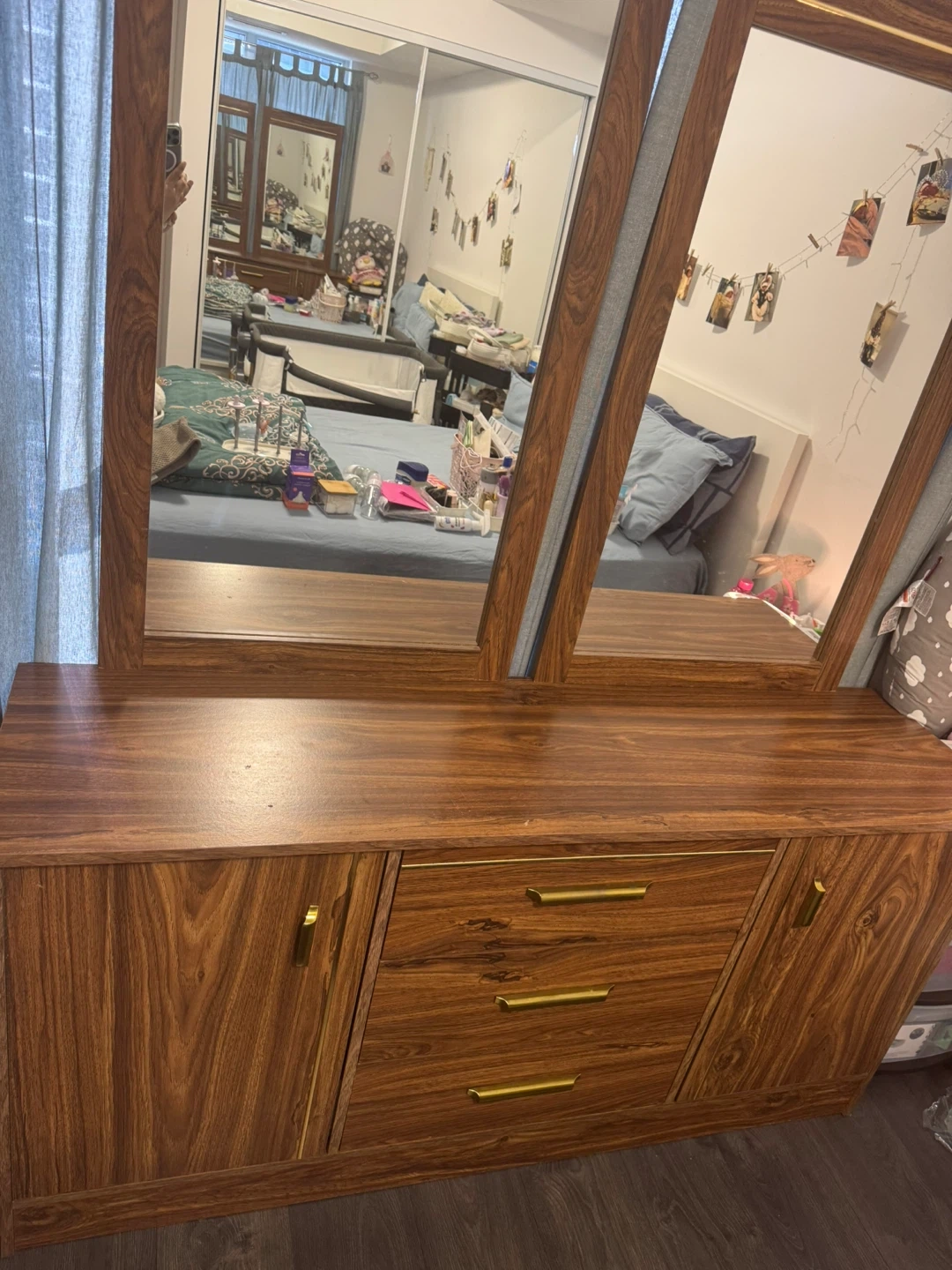 Elegant solid wood dresser with a large mirror, perfect for a bedroom or dressing area. The rich wood grain and modern gold handles give it a stylish, high-end look.