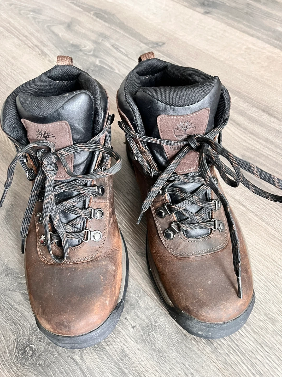 Classic Timberland brown leather hiking boots. Men's size 8.5 (US). Made in Indonesia. These boots are ready for your next adventure!