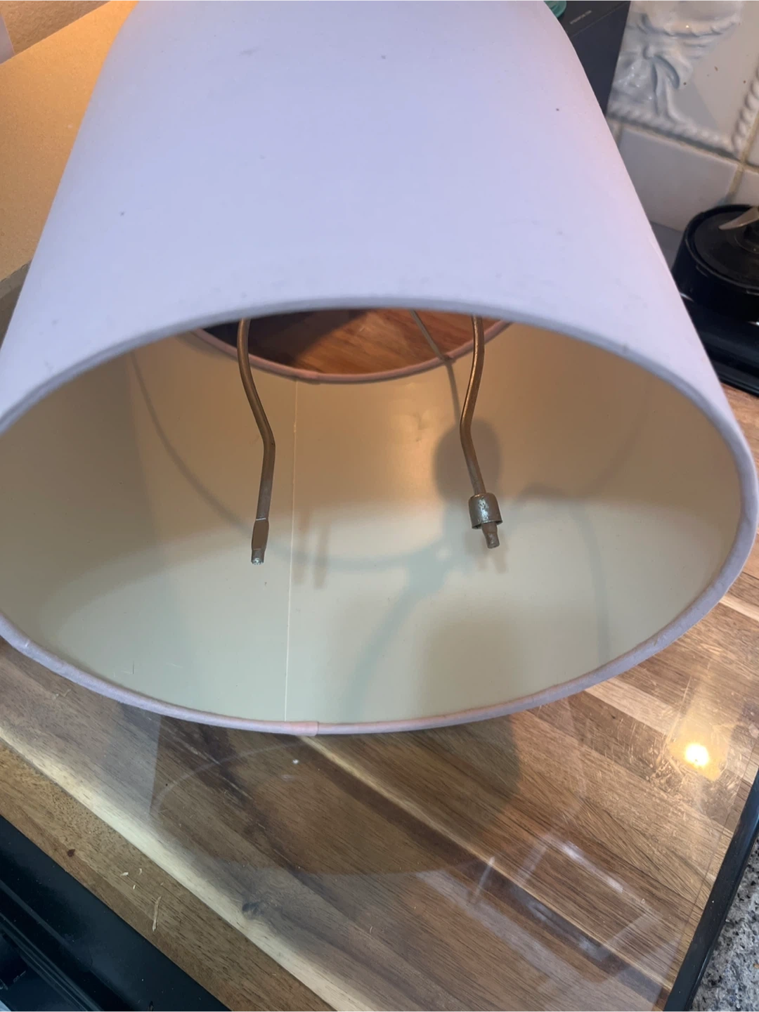 This is a light pink, cylindrical lamp shade. It has a metal finial at the top and a metal frame inside. The interior lining is a cream color. It's suitable for a table or floor lamp.