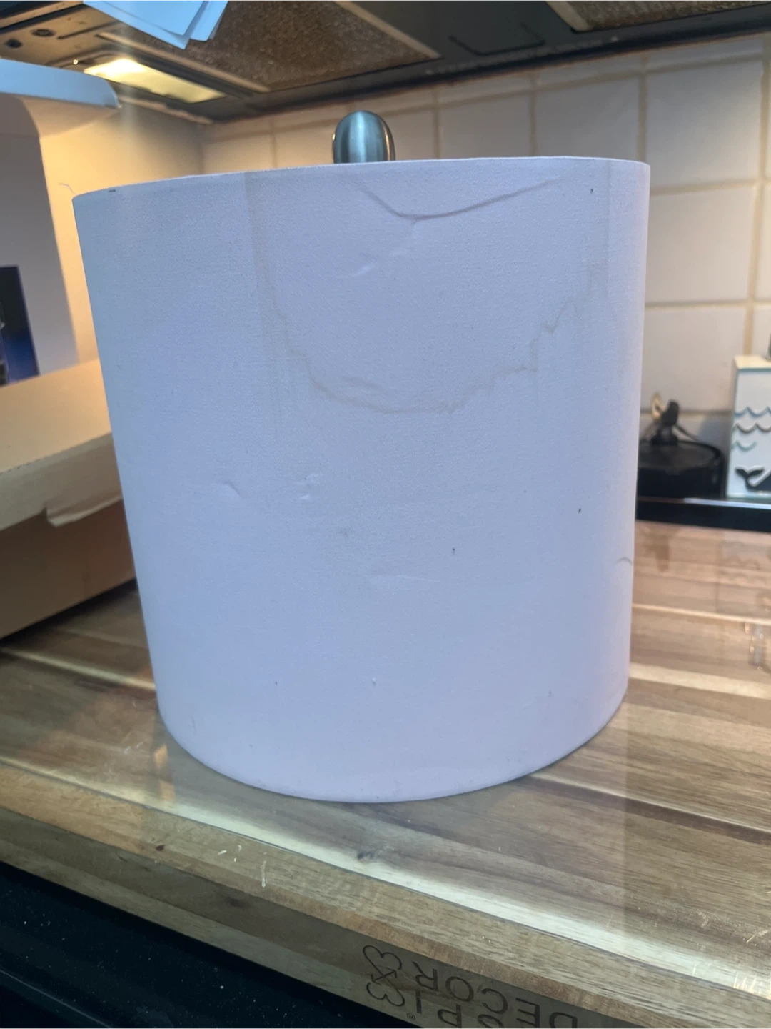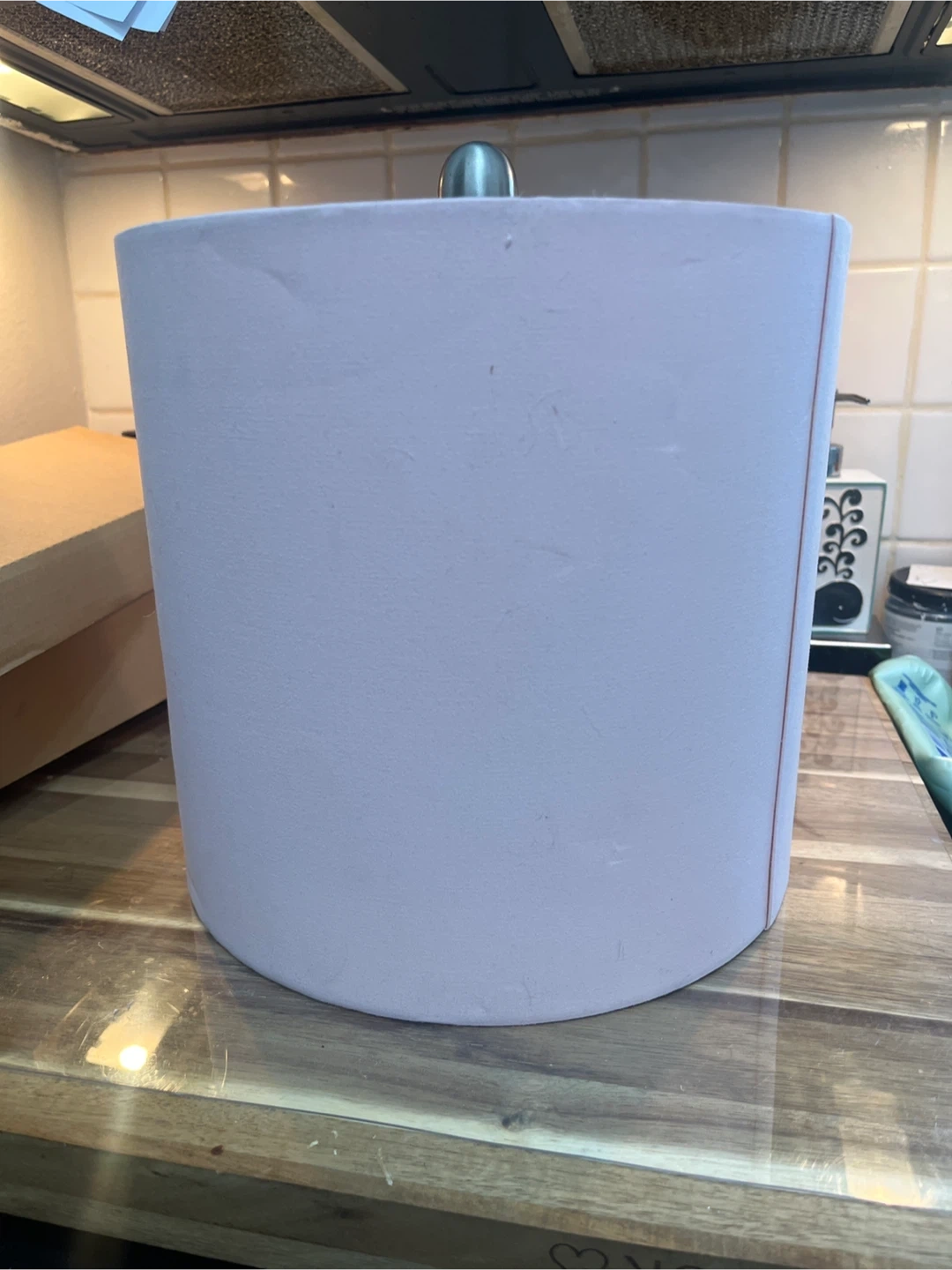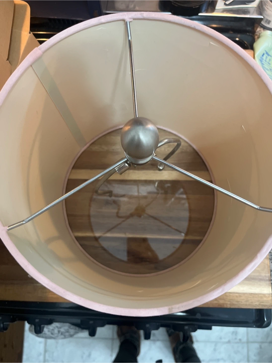 This is a light pink, cylindrical lamp shade. It has a metal finial at the top and a metal frame inside. The interior lining is a cream color. It's suitable for a table or floor lamp.