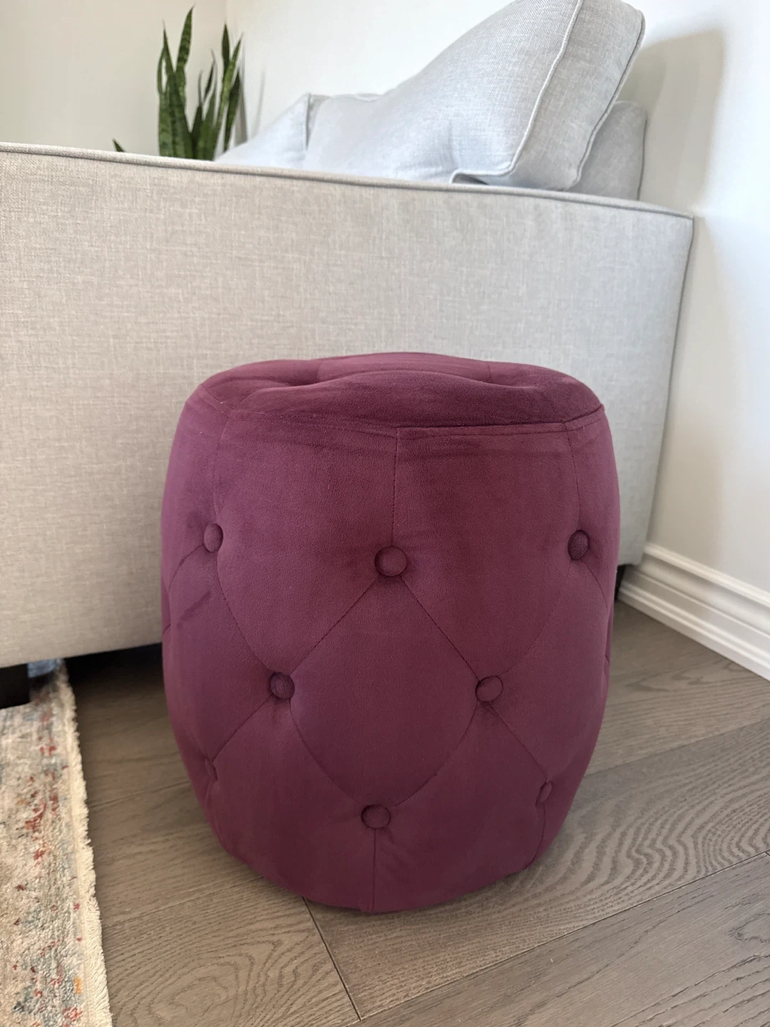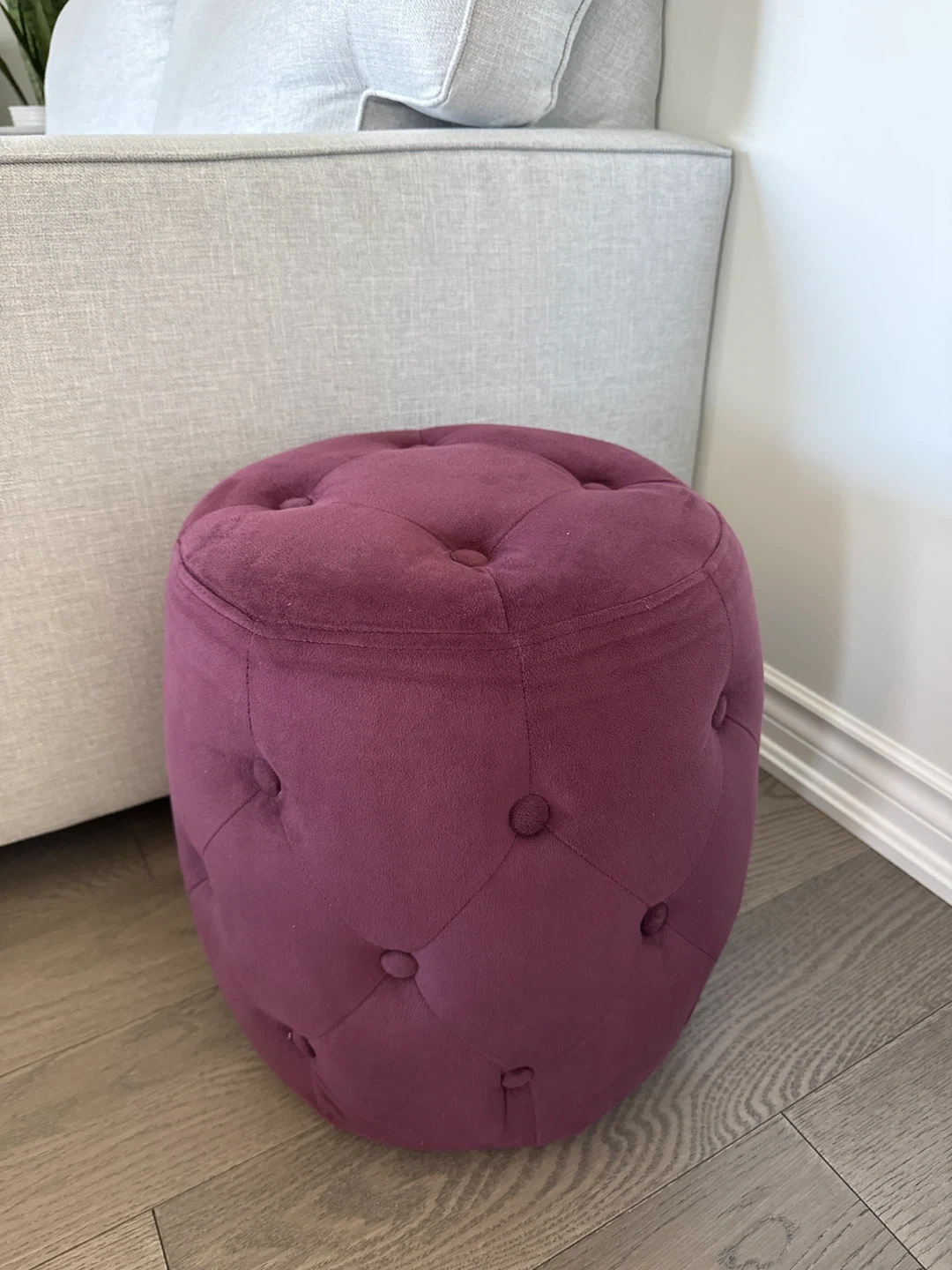 A lovely plum-coloured velvet ottoman with deep button tufting. This round footstool adds a stylish touch to any room. It's compact and lightweight, making it easy to move.