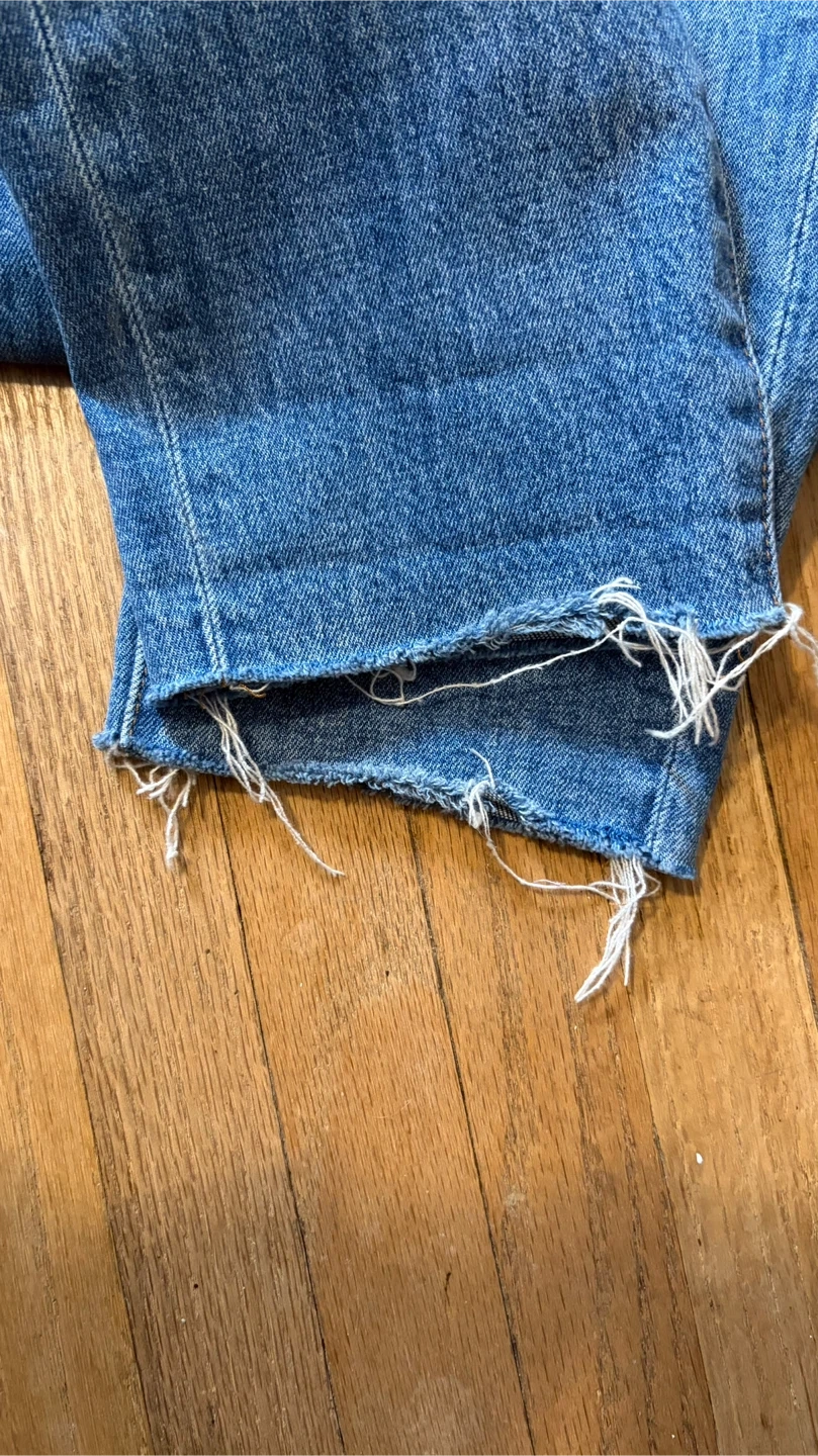 Madewell The Perfect Vintage Jeans in size 25. These jeans feature a classic blue wash with a slightly distressed hem. They're made from durable denim.