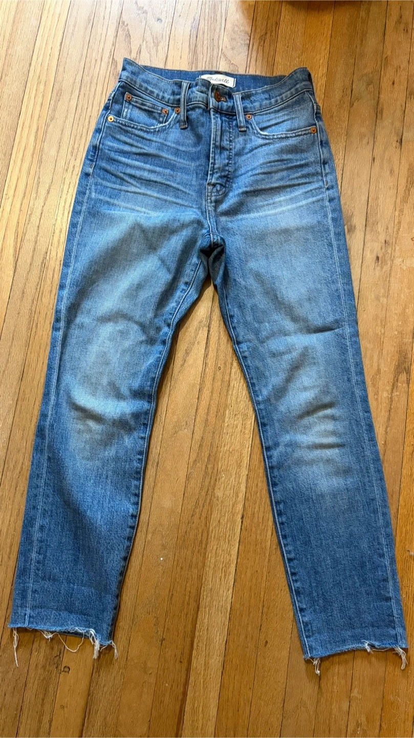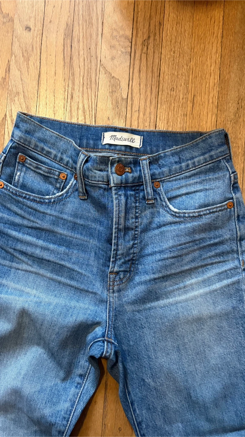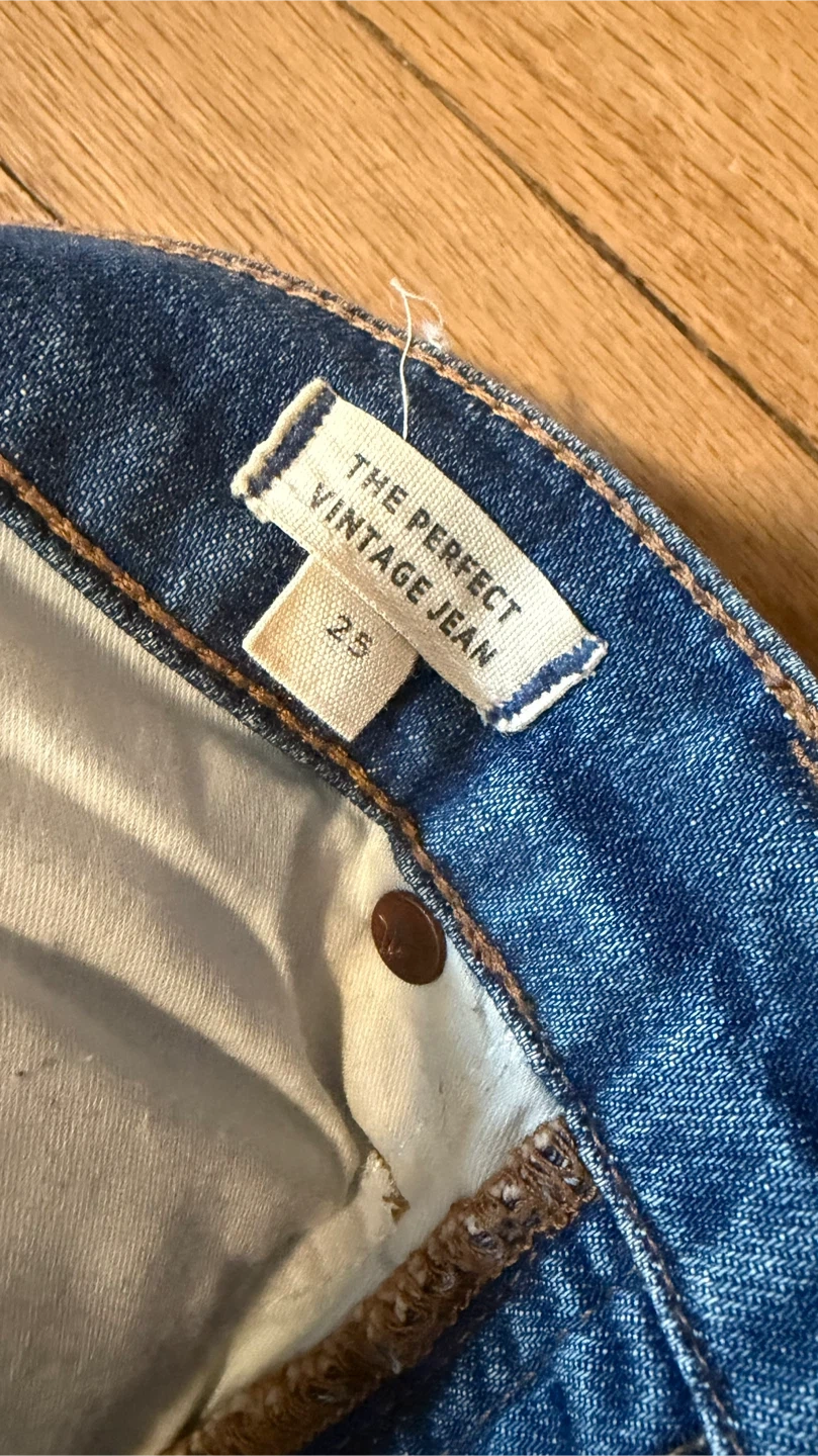 Madewell The Perfect Vintage Jeans in size 25. These jeans feature a classic blue wash with a slightly distressed hem. They're made from durable denim.