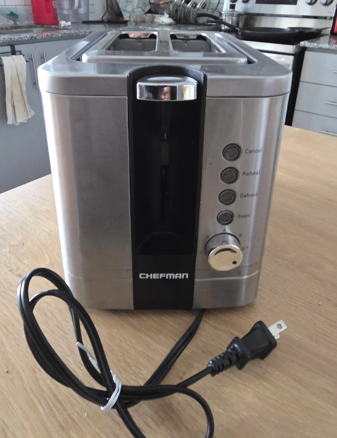 Selling a Chefman toaster. It's in good condition and ready for a new kitchen! It has settings for cancel, reheat, defrost, and bagel