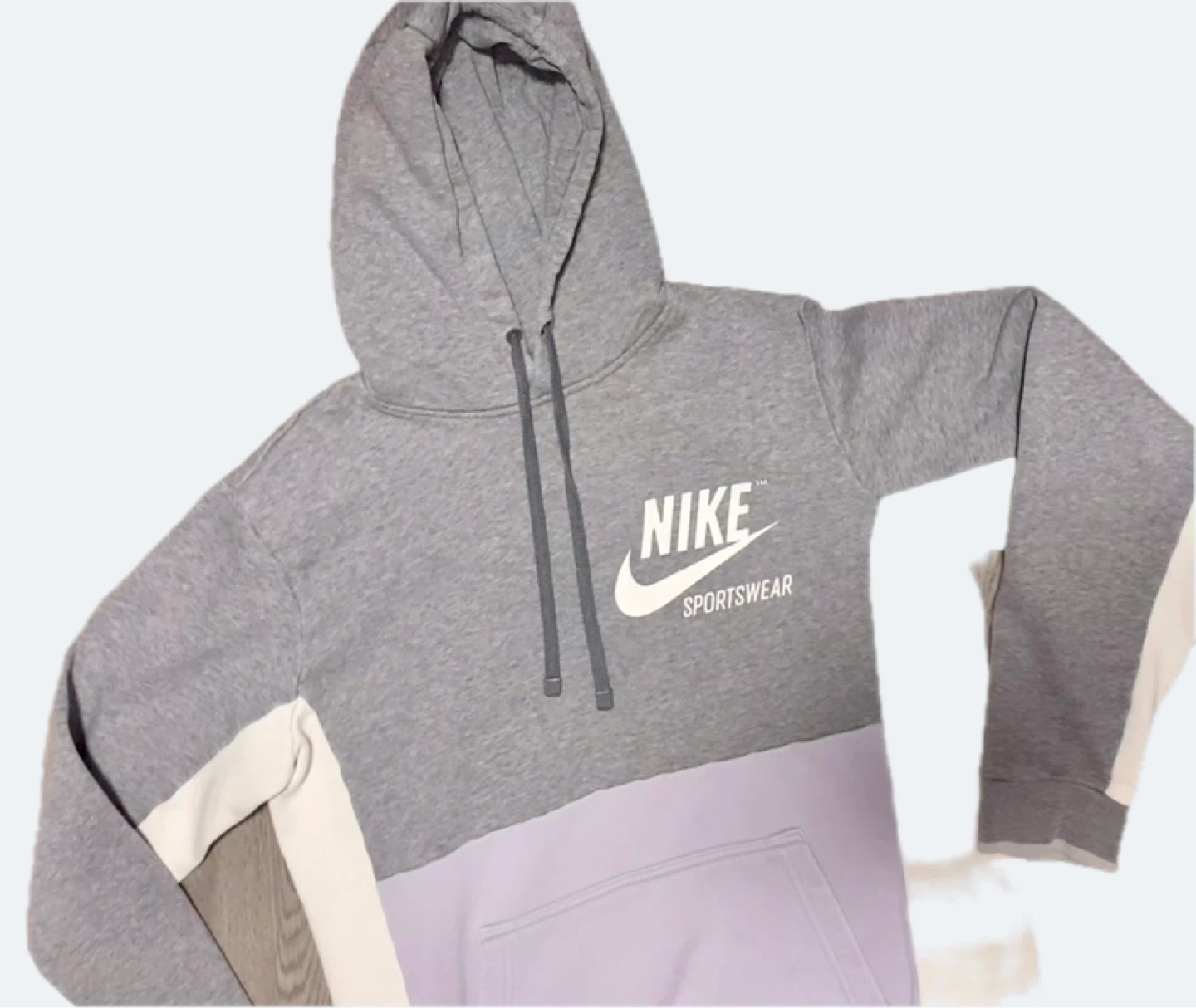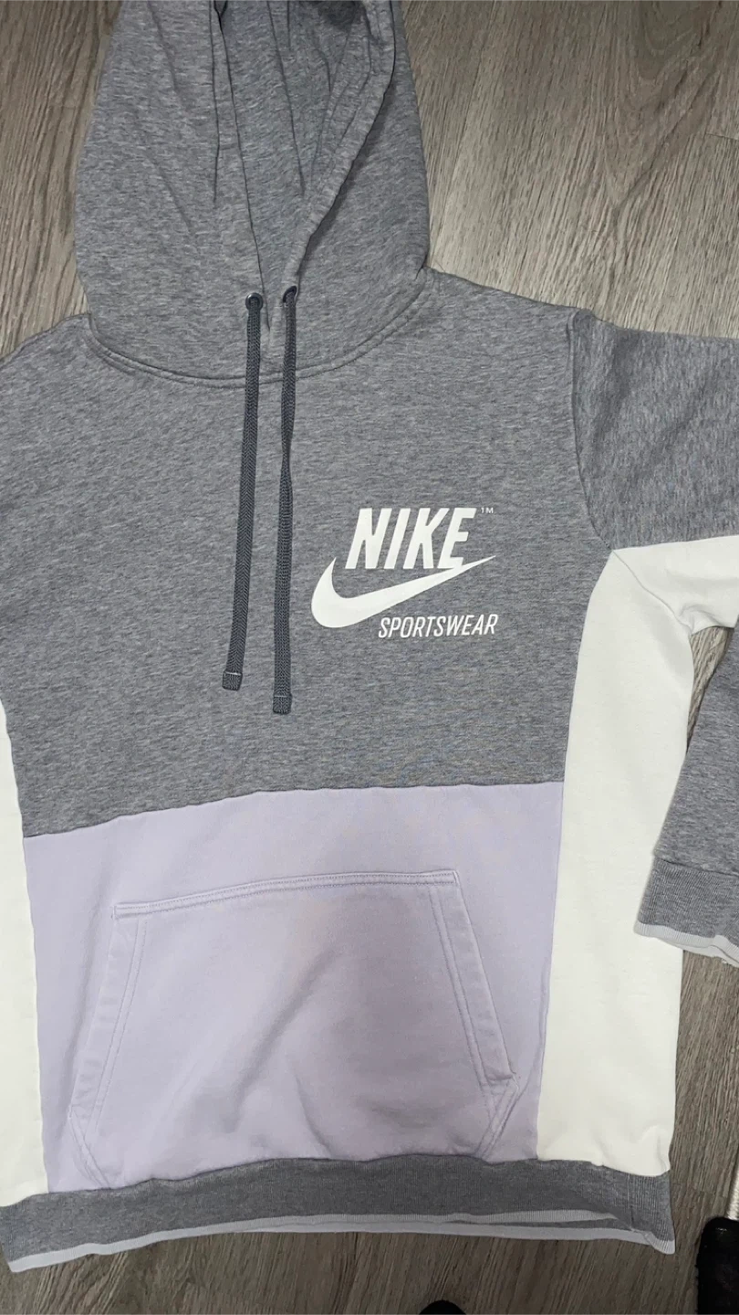 Selling a Nike Sportswear hoodie in a stylish grey, purple, and white colour block design. It's in great condition and perfect for staying cozy!