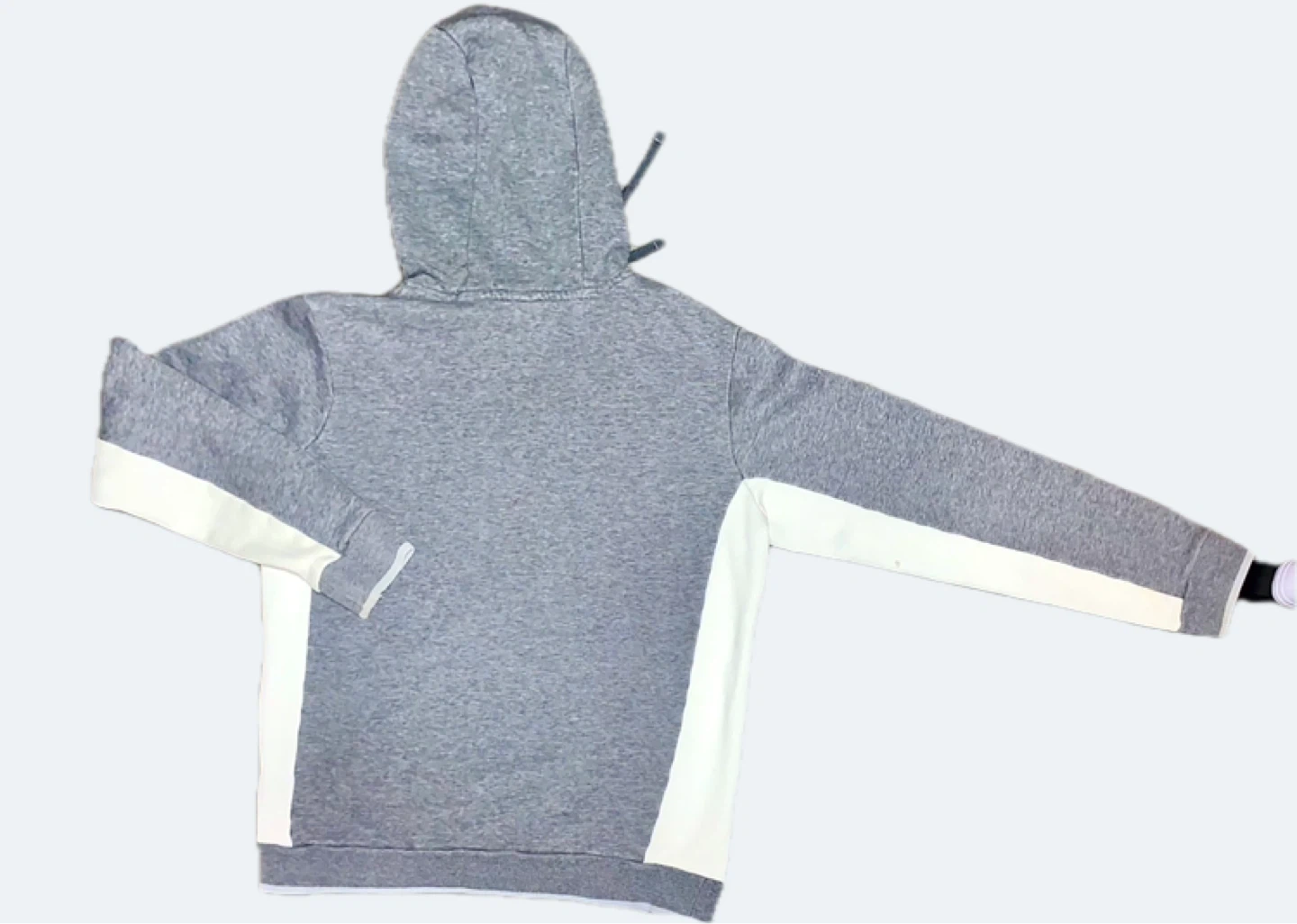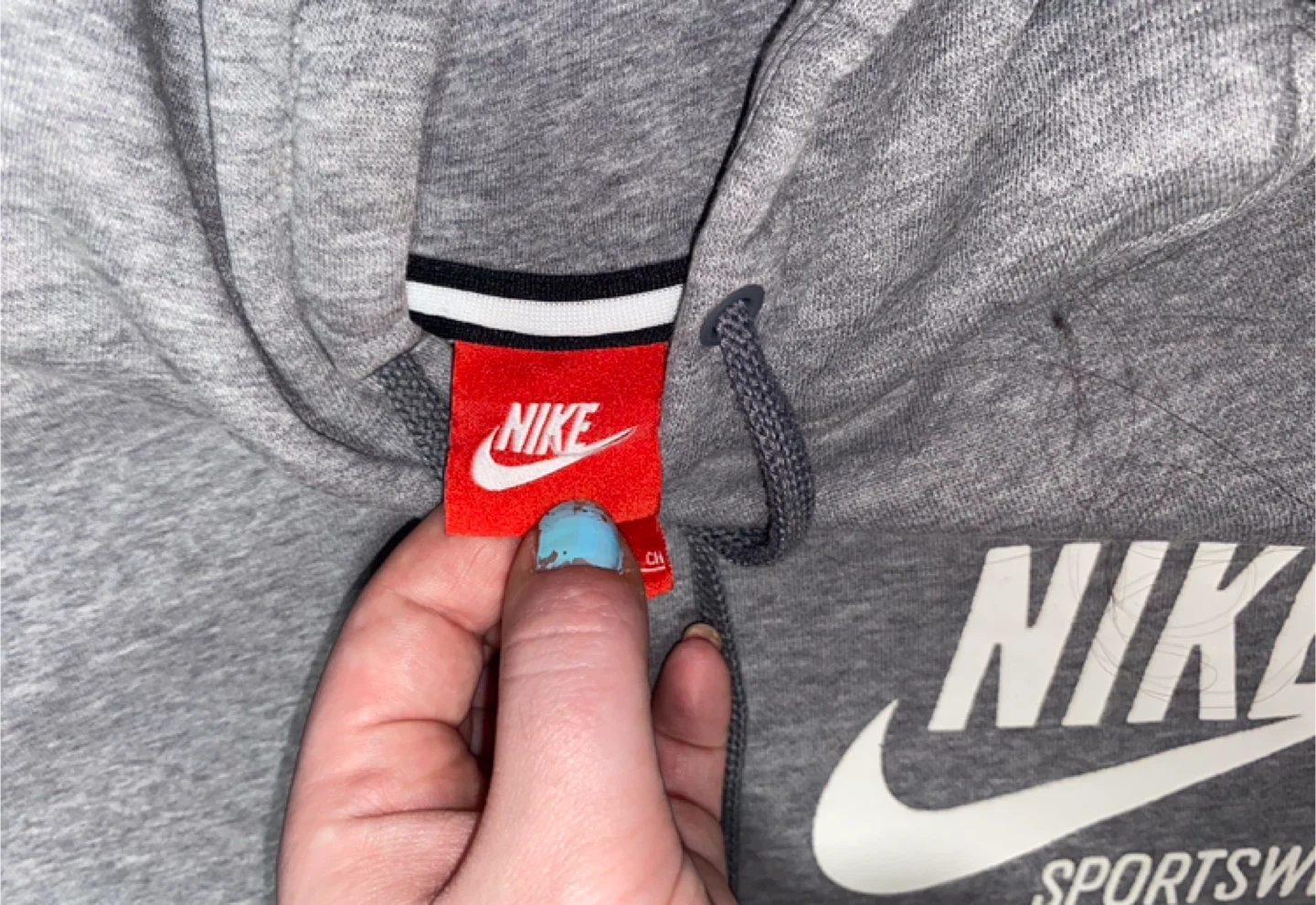 Selling a Nike Sportswear hoodie in grey with a white logo. It has a nice colour block design with white and lavender accents. It's in great condition and ready for a new home!