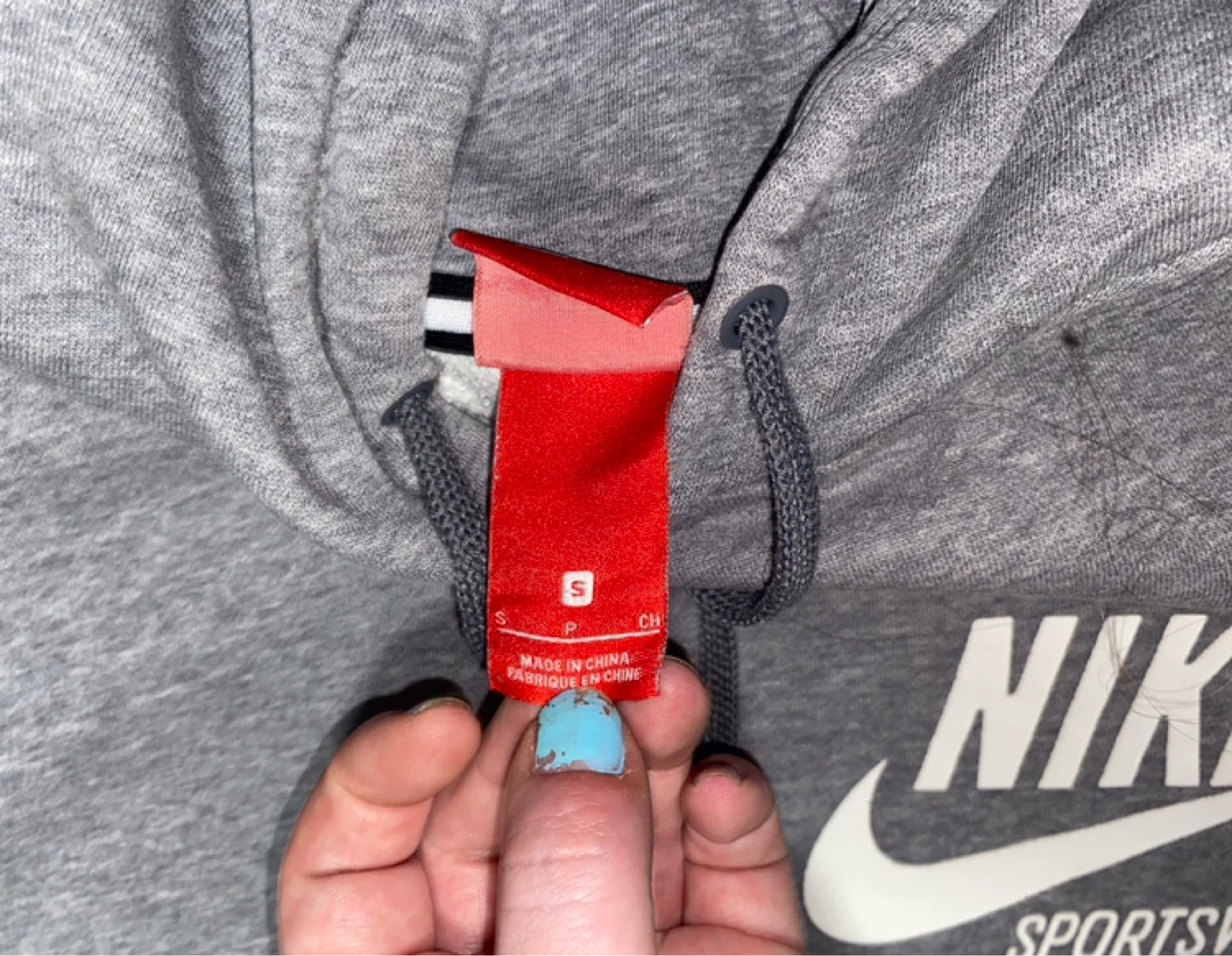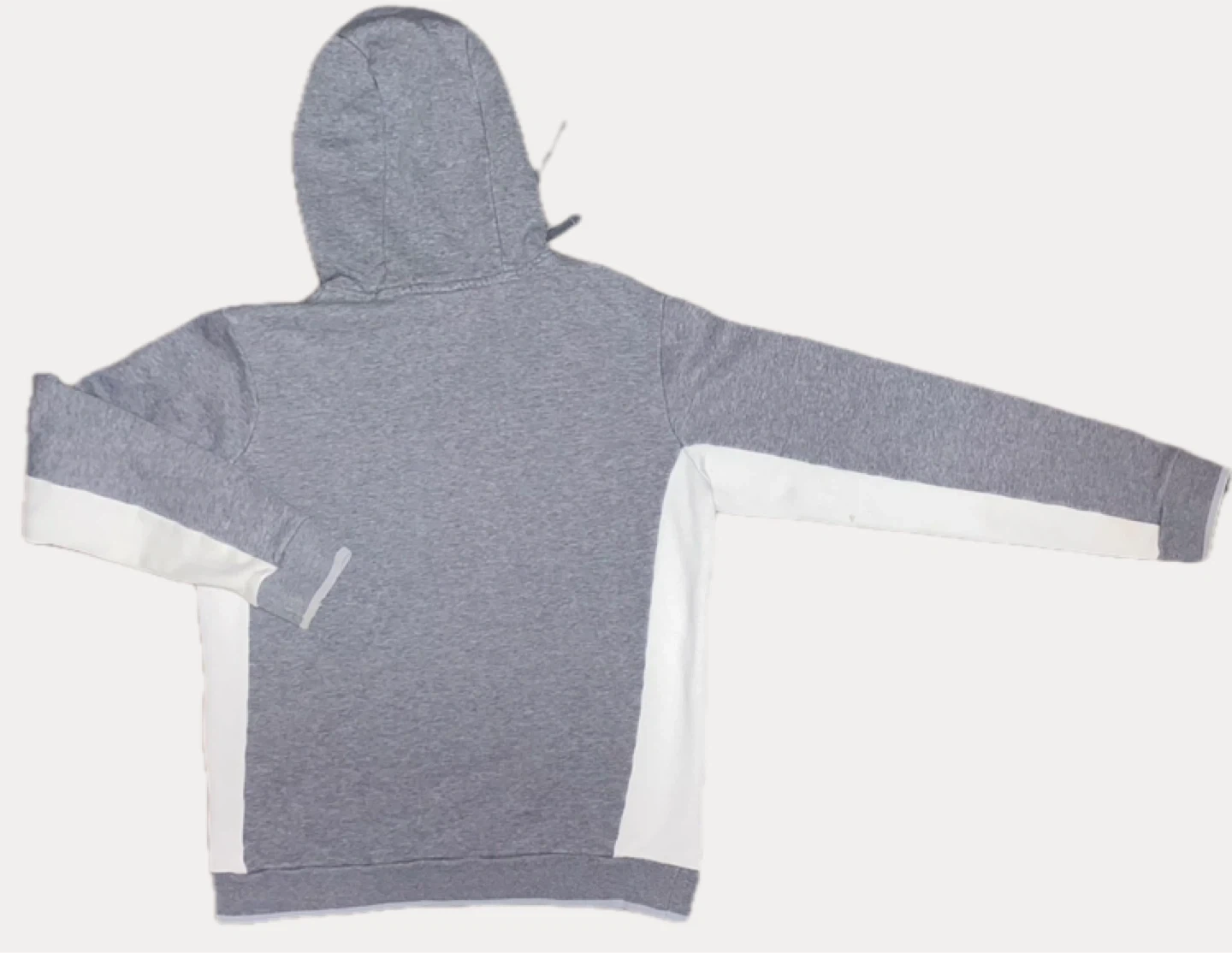 Selling a Nike Sportswear hoodie in grey with a white logo. It has a nice colour block design with white and lavender accents. It's in great condition and ready for a new home!