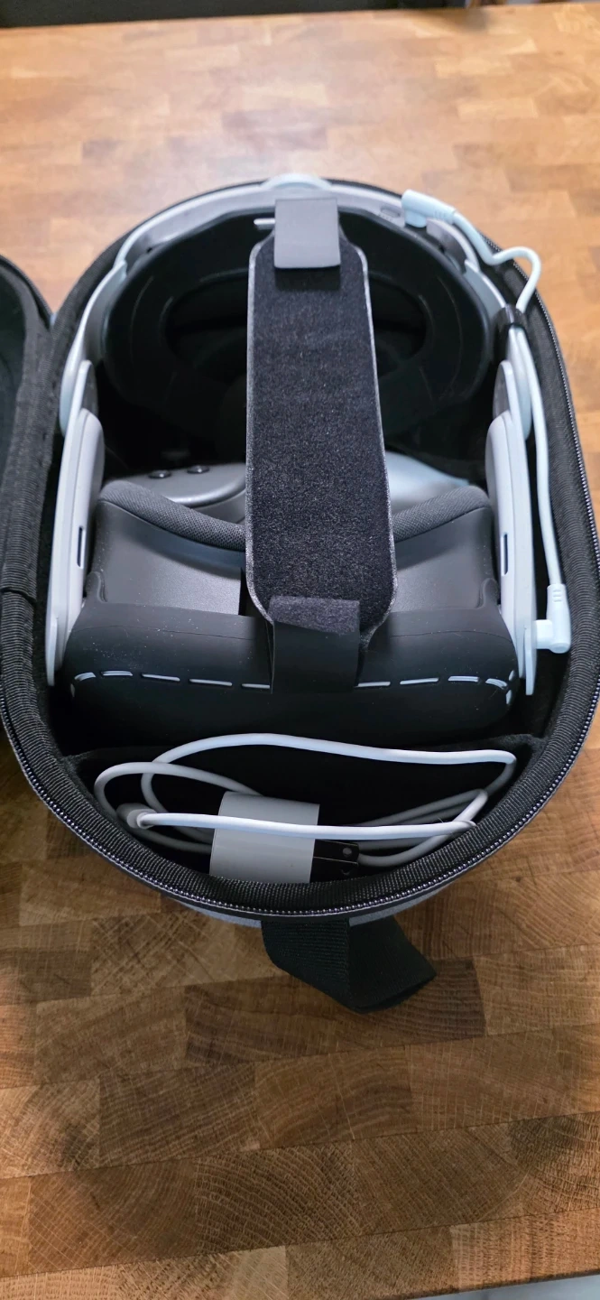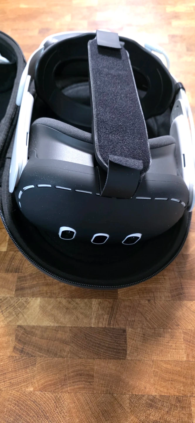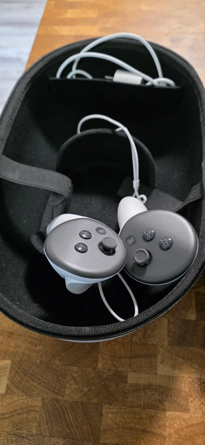 This is a complete Meta Quest 3 virtual reality headset set. It includes the headset, two controllers, and must have battery head strap and a protective carrying case. The case is grey and hard-shelled, perfect for travel and storage. Get ready for immersive gaming and experiences!