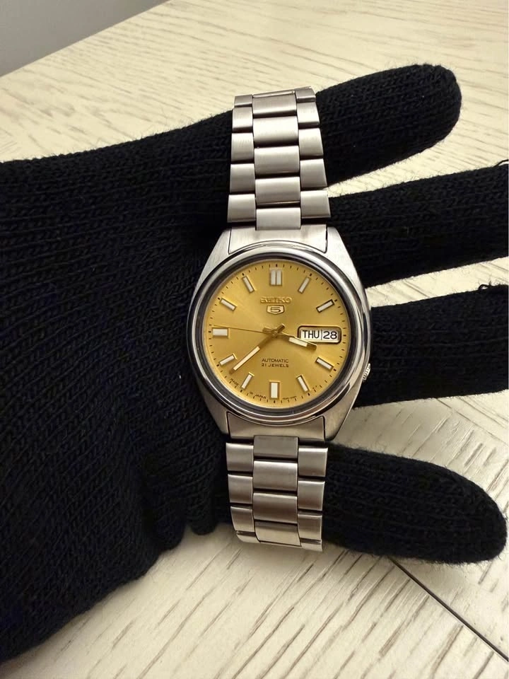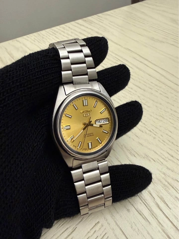 Classic Seiko 5 automatic men's watch with gold sunburst dial and stainless steel bracelet. Clean, timeless design with day/date display at 3 o'clock and 21-jewel automatic movement