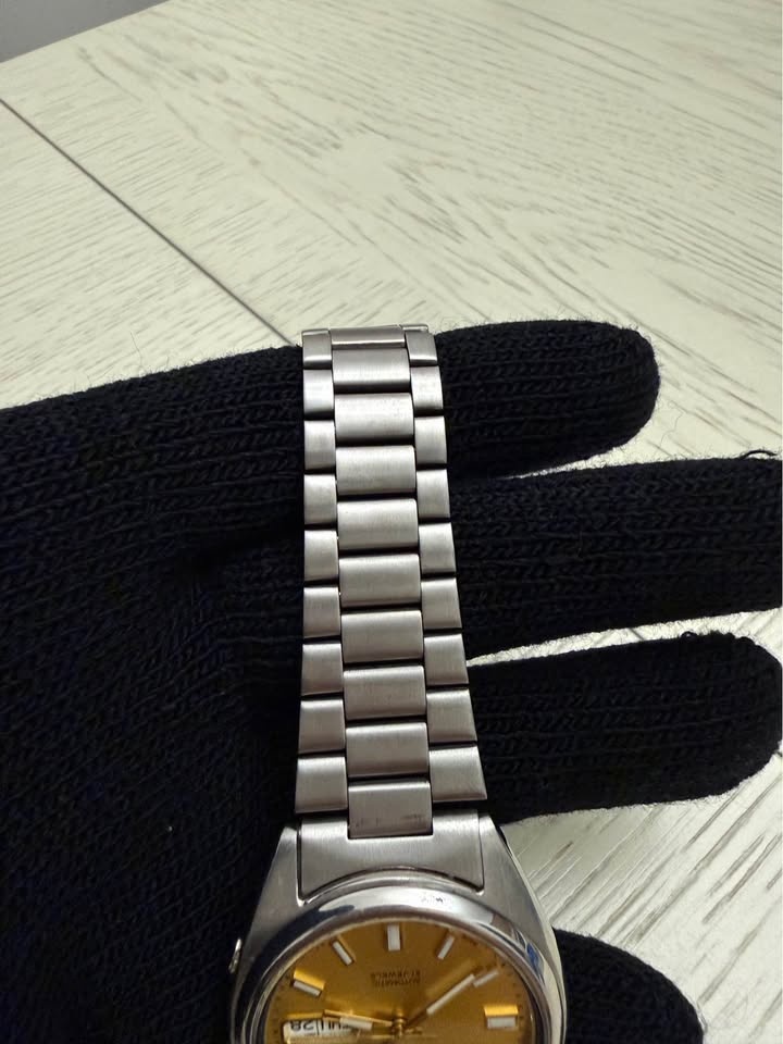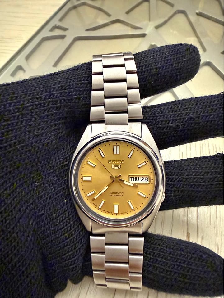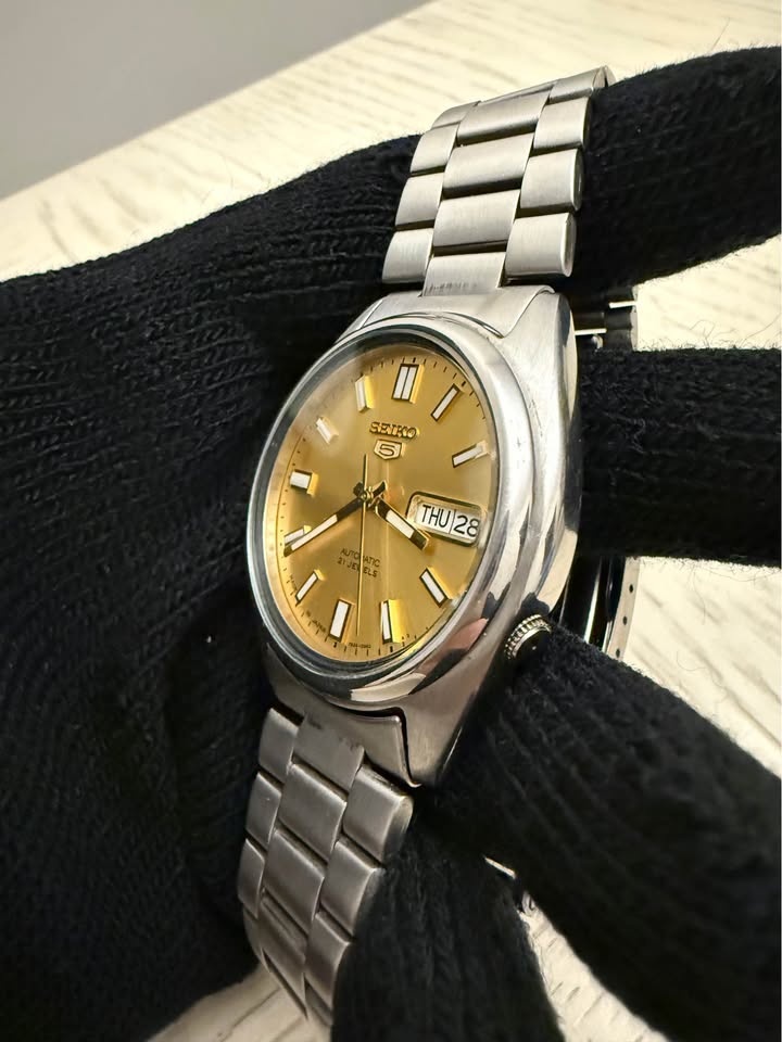 Classic Seiko 5 automatic men's watch with gold sunburst dial and stainless steel bracelet. Clean, timeless design with day/date display at 3 o'clock and 21-jewel automatic movement