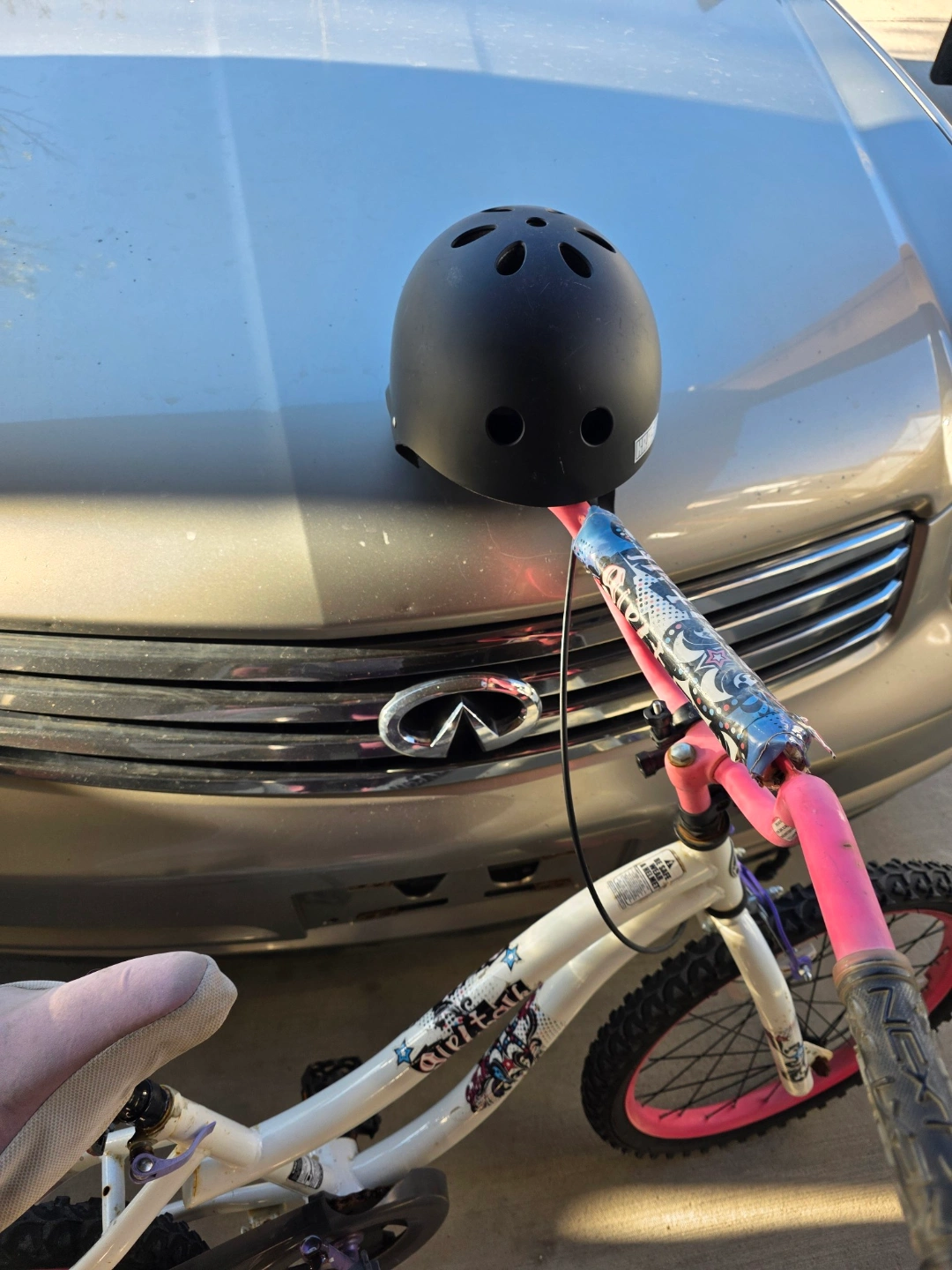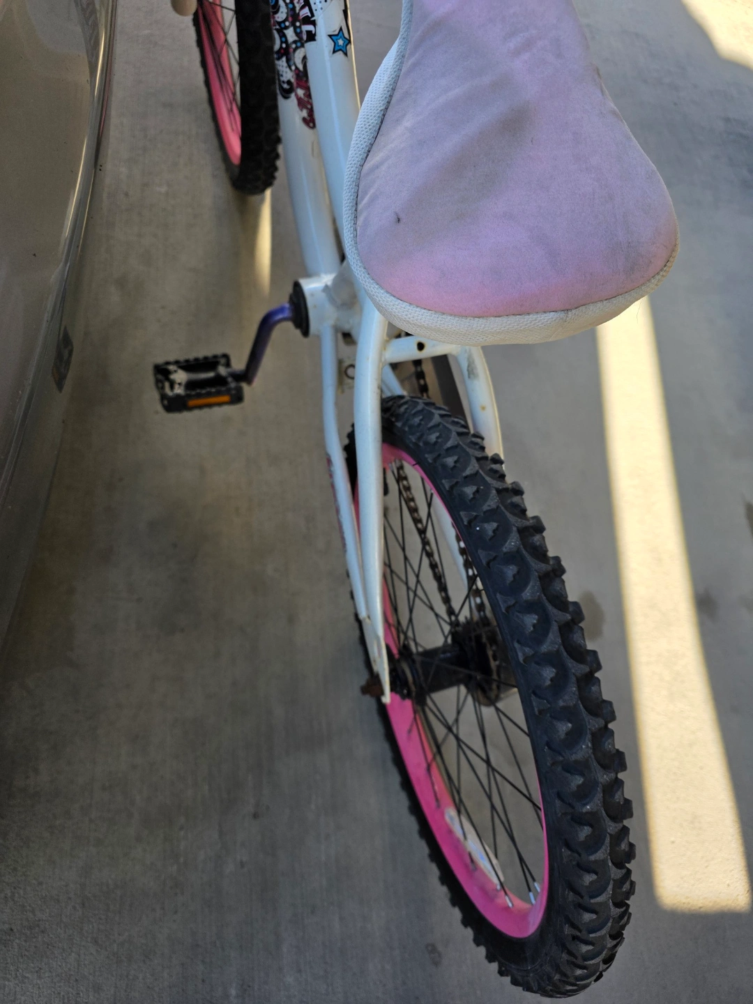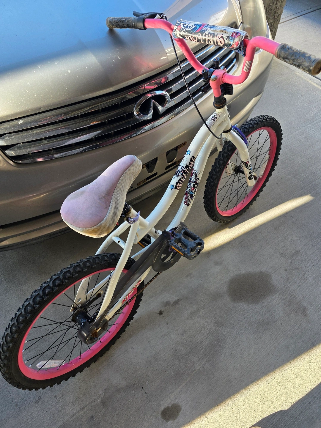 Used girls' bike. White frame with pink accents. Features include: . Small size/medium, likely for younger children. Shows some wear and tear. Helmet included. sorry no helmet