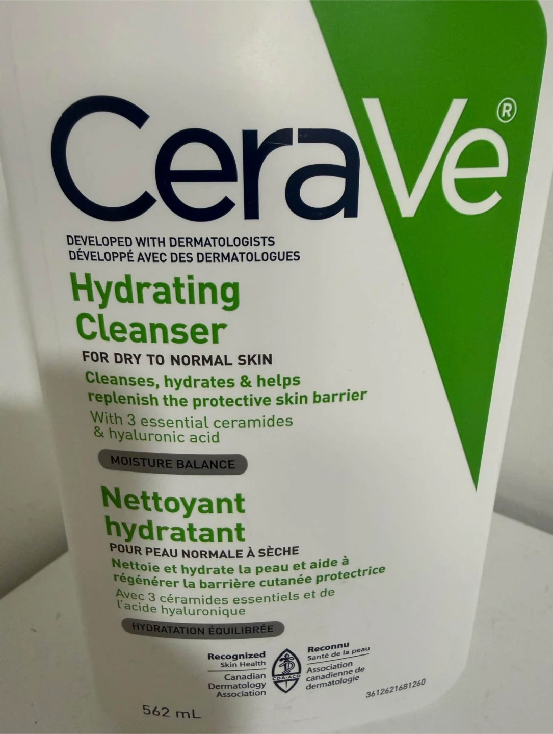 CeraVe Hydrating Cleanser for dry to normal skin. It cleanses, hydrates & helps replenish the protective skin barrier. Contains 3 essential ceramides & hyaluronic acid. 562 mL bottle.