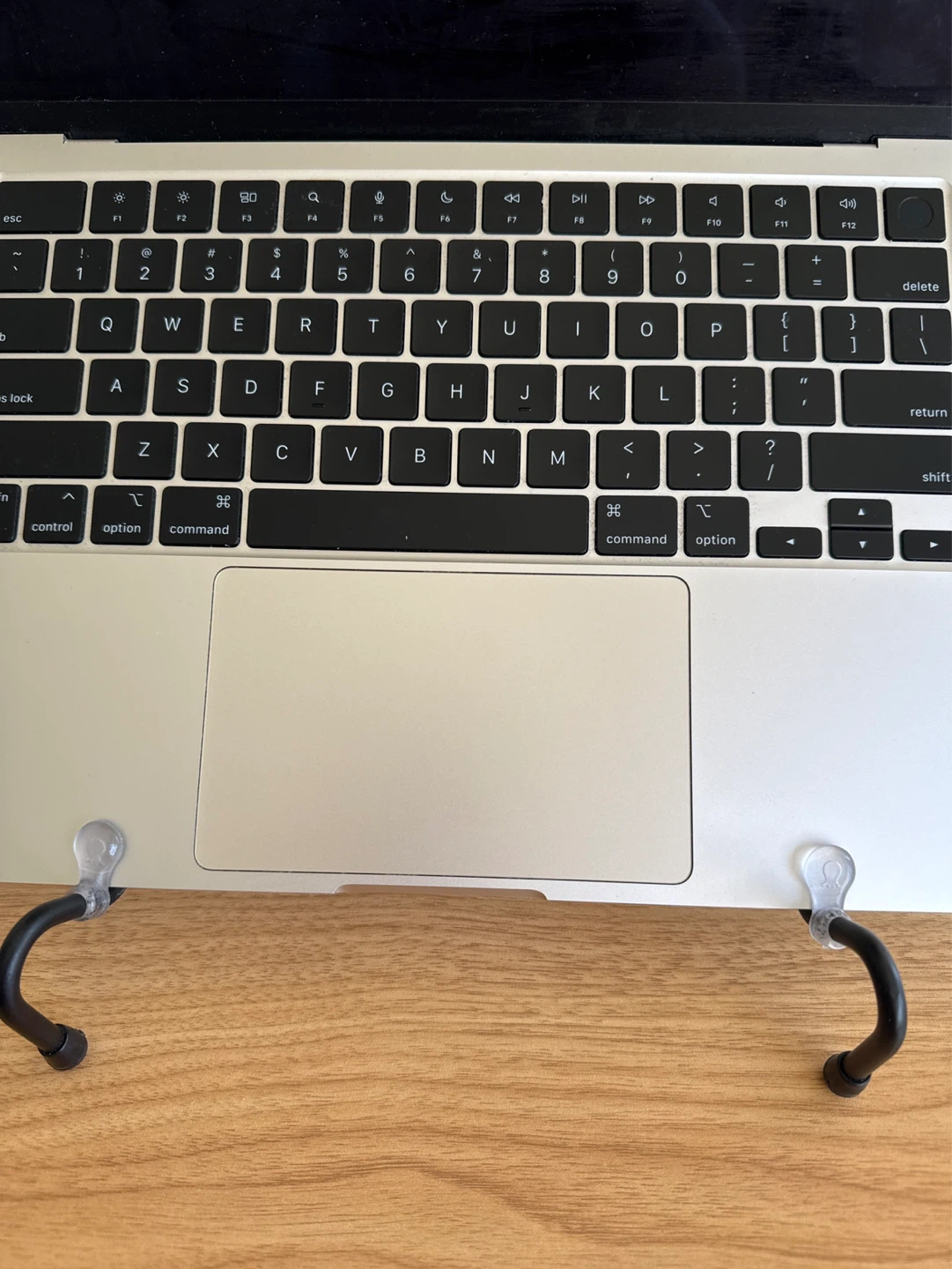 This adjustable black metal stand props up your laptop for better airflow. It's made of durable metal and features clear rubber stoppers to keep your device secure. It's useful for improving typing comfort and cooling during extended use.
