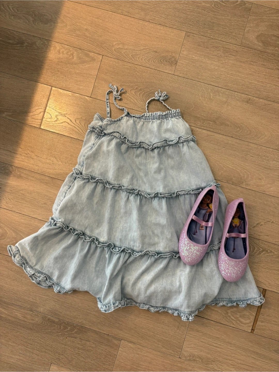 This is a baby Gap denim tiered dress in size 5 years, worn only once. Also included are a new pair of light purple glitter ballet flats in size 31. Pickup Queen and Yonge or Queen and broadview.