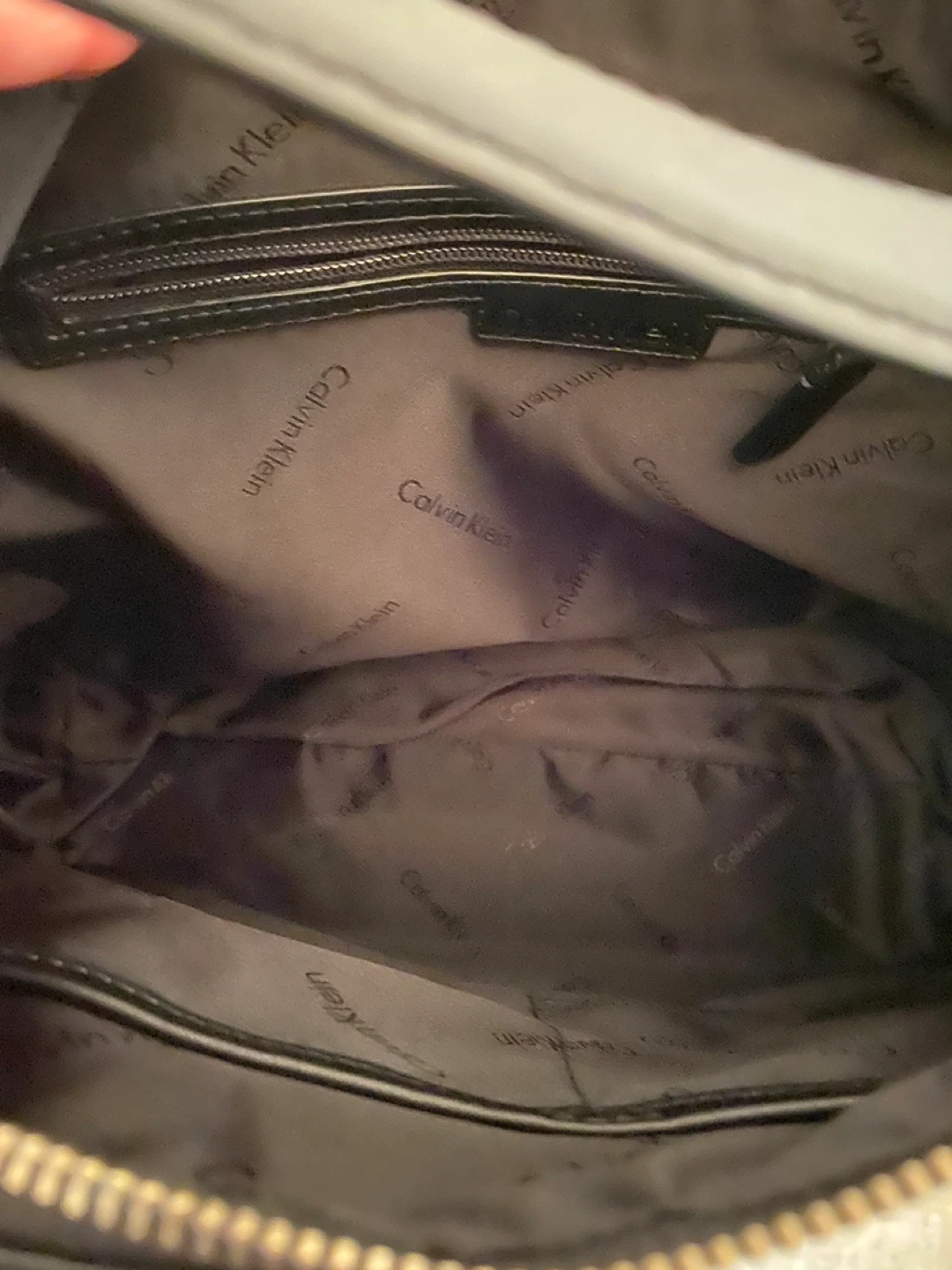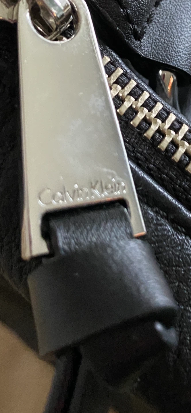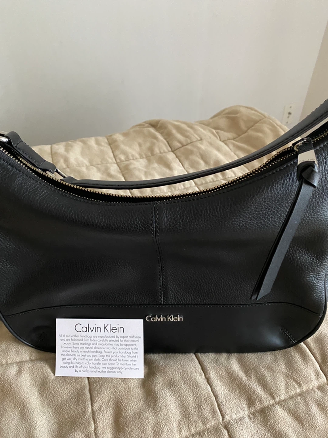 This is a black leather hobo handbag from Calvin Klein. It features a zip closure and an exterior zip pocket. The interior is lined with branded fabric and has a zip pocket. It's a classic accessory that's great for everyday use! Never worn