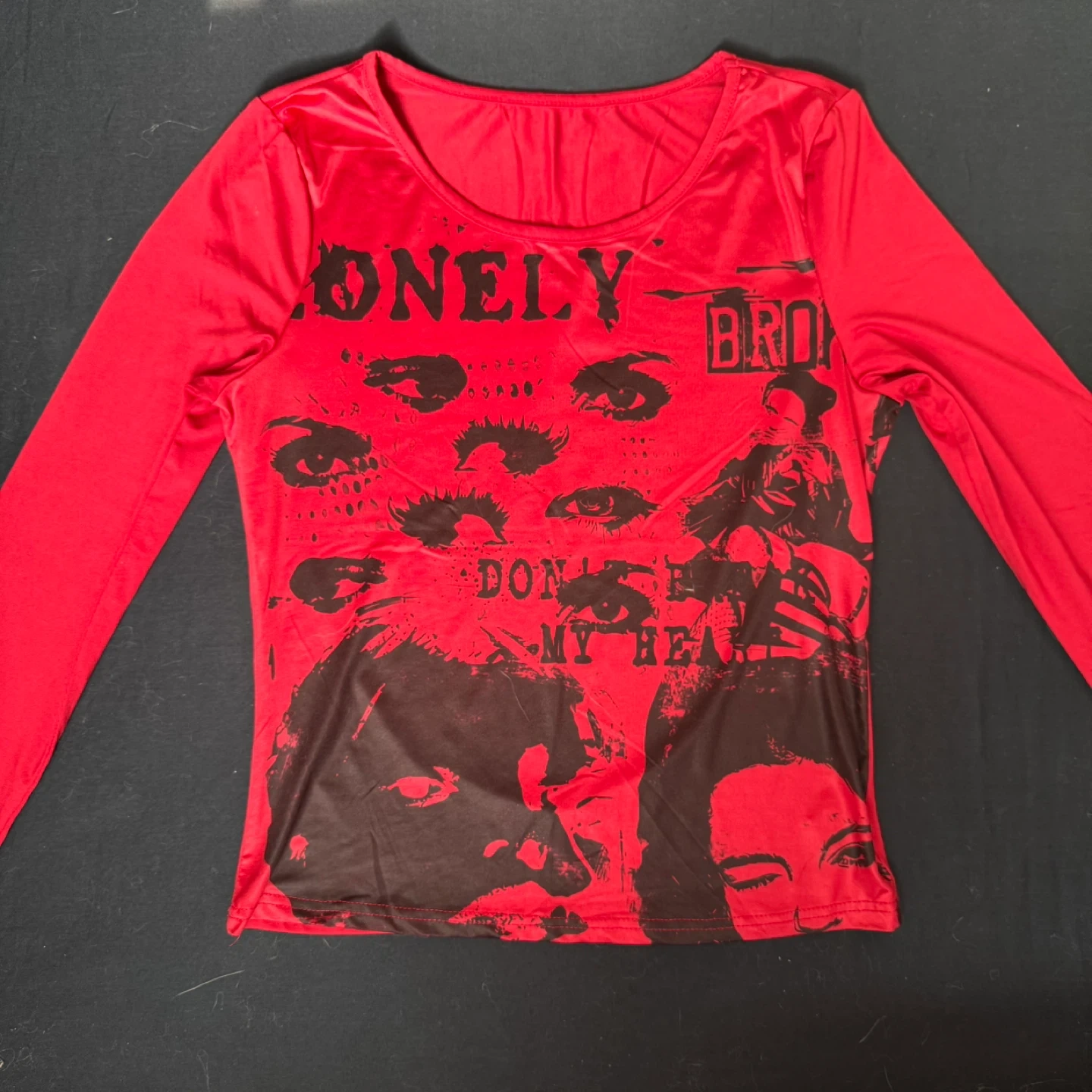 This red long-sleeve top features a graphic print with 'Lonely' and 'Don't Break My Heart' text. It's made from a stretchy material. This top adds a unique edge to any outfit.