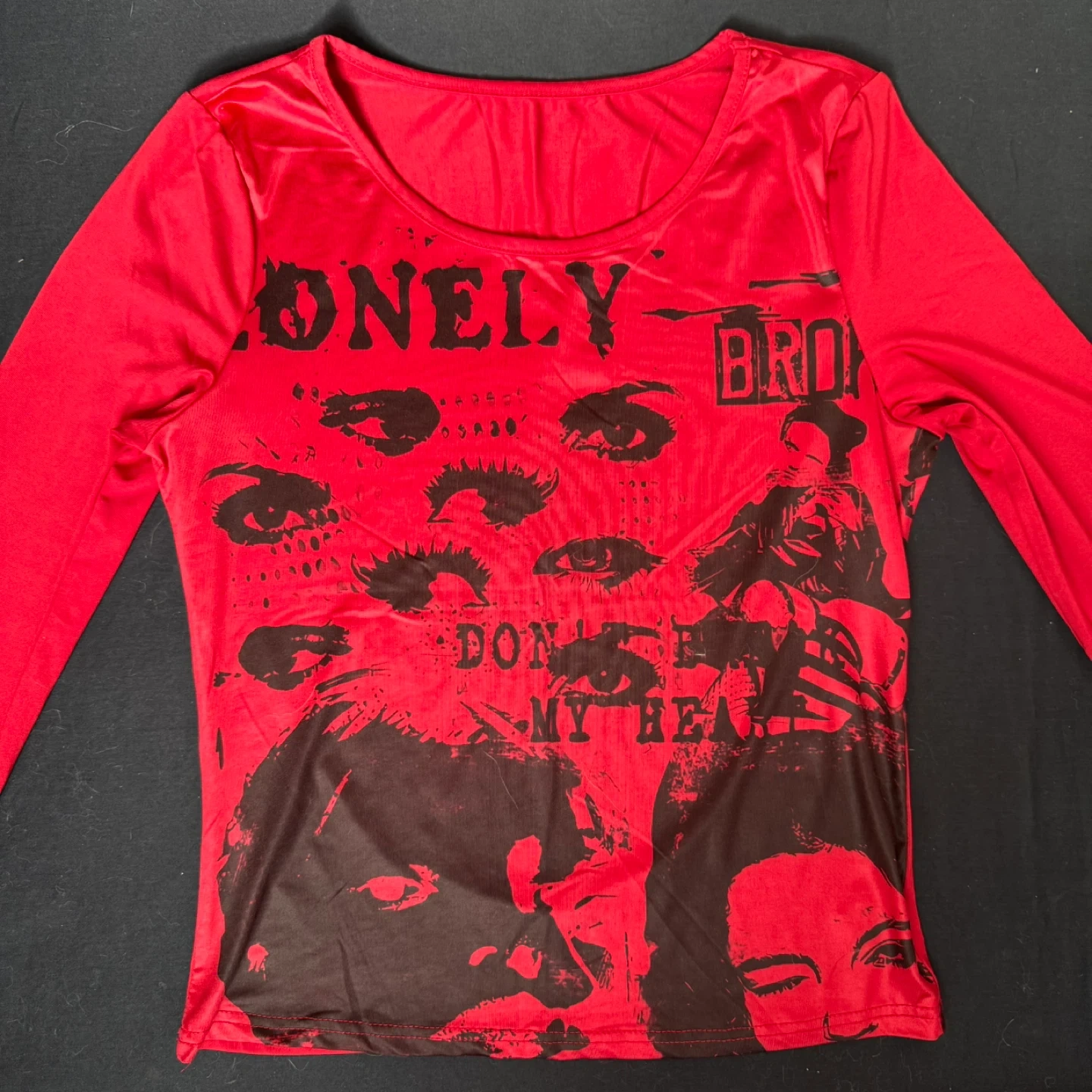 This red long-sleeve top features a graphic print with 'Lonely' and 'Don't Break My Heart' text. It's made from a stretchy material. This top adds a unique edge to any outfit.
