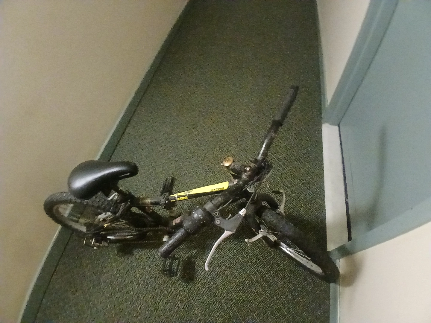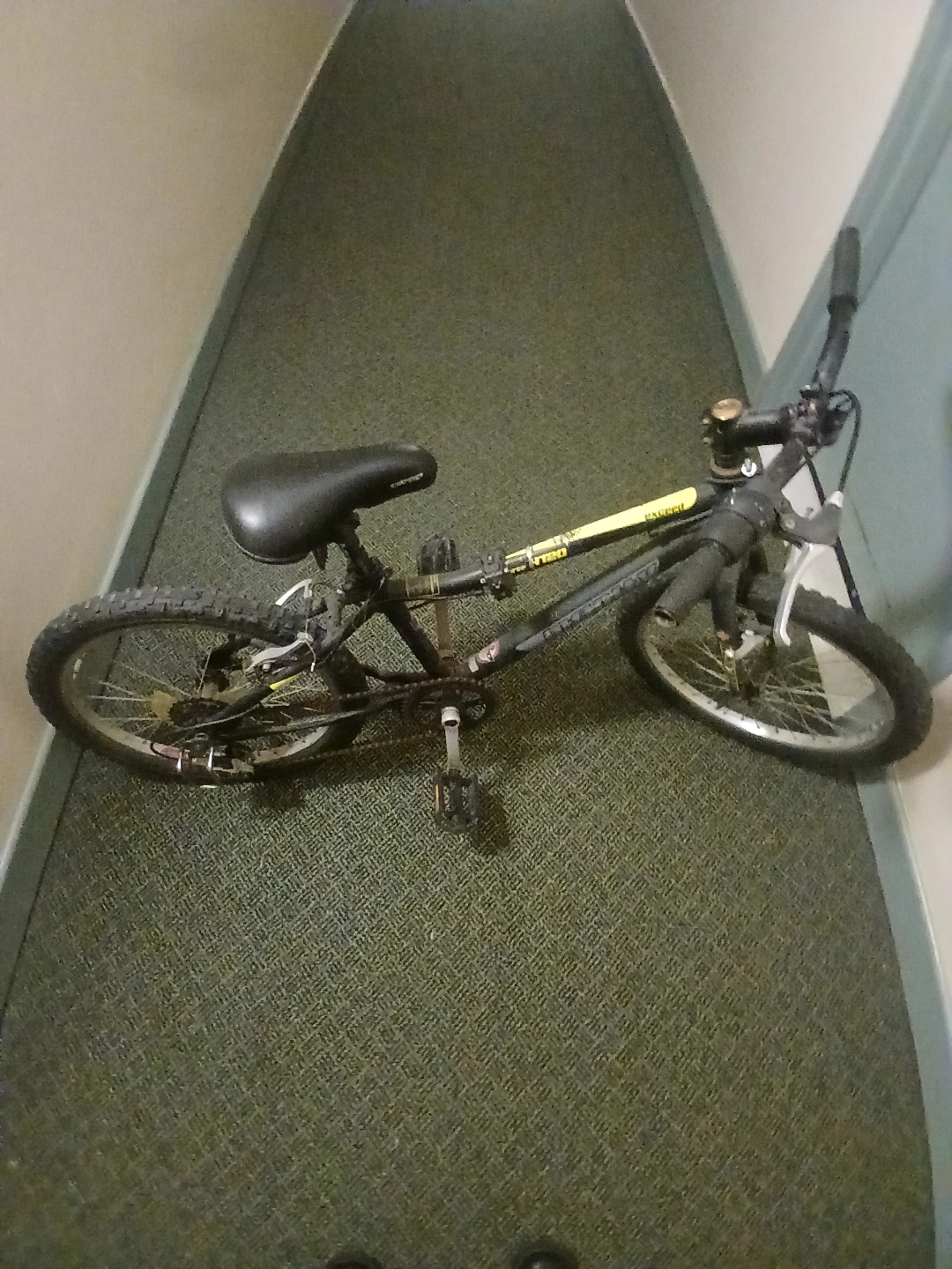 A bicycle, likely suitable for a child. Includes tires, a seat, and handlebars. The frame has a few different colour accents.