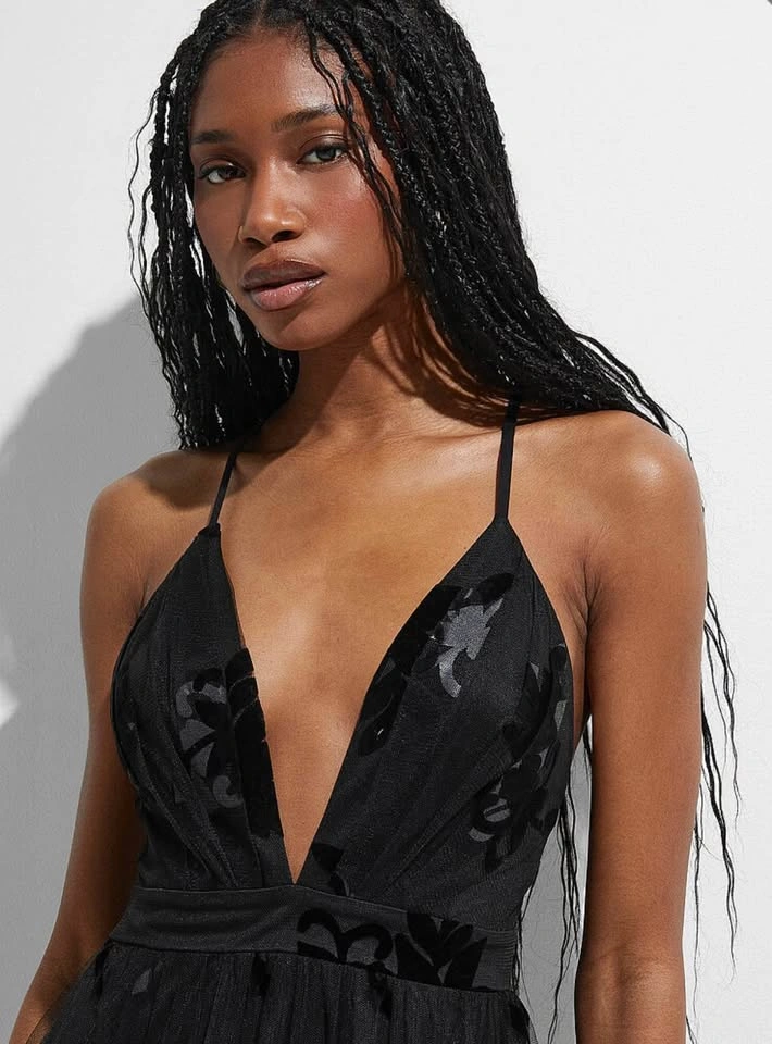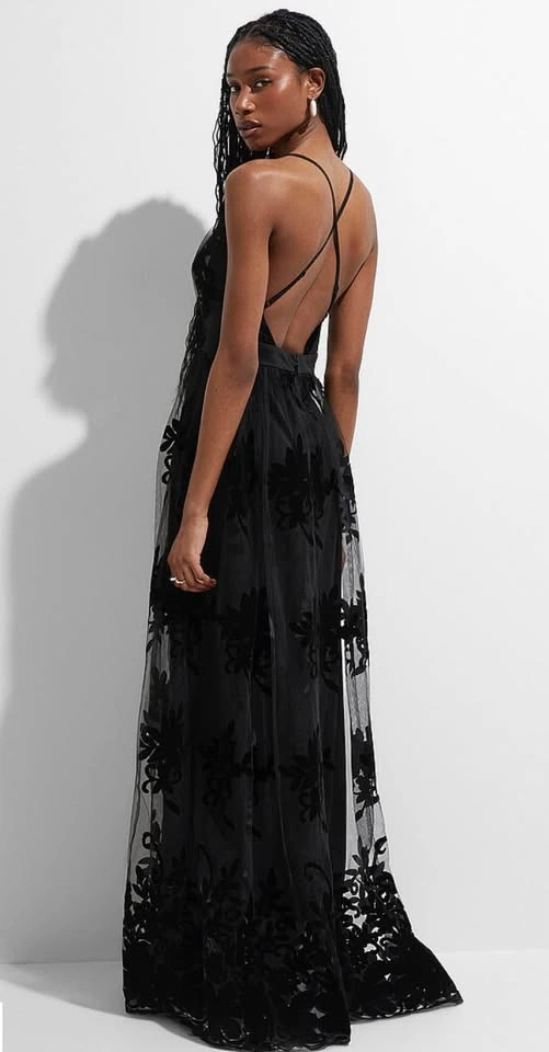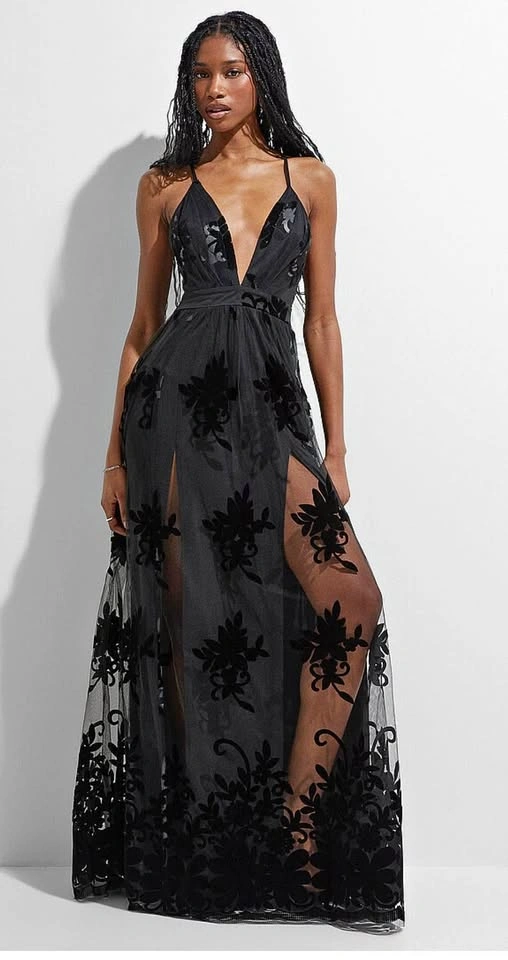 Lightweight and sheer tulle with flocked velvet floral pattern
